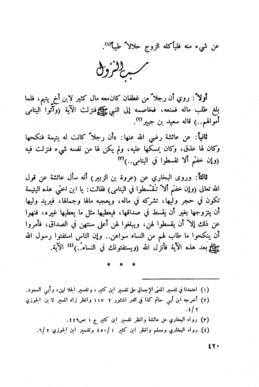 ثالثاً: وروى البخاري عن (عروة بن الزبير) أنه سأل عائشة عن قول الله تعالى {وَإِنْ خِفْتُمْ أَلاَّ تُقْسِطُواْ فِي اليتامى} فقالت: يا ابن أختي هذه اليتيمة تكون في حجر وليها، تشركه في ماله، ويعجبه مالها وجمالها، فيريد وليها أن يتزوجها بغير أن يقسط في صداقها، فيعطيها مثل ما يعطيها غيره، فنهوا عن ذلك إلاّ أن يقسطوا لهن، ويبلغوا لهن أعلى سنتهن في الصداق، فأمروا أن ينكحوا ما طاب لهم من النساء سواهن. . وإن الناس استفتوا رسول الله صَلَّى اللَّهُ عَلَيْهِ وَسَلَّم َ بعد هذه الآية فأنزل الله {وَيَسْتَفْتُونَكَ فِي النسآء ... } [النساء: 127] الآية.