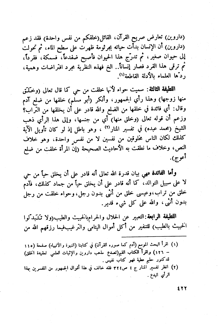 (داروين) تعارض صريح القرآن، القائل {خَلَقَكُمْ مِّن نَّفْسٍ وَاحِدَةٍ} فقد زعم (داروين) أن الإنسان بدأت حياته بجرثومة ظهرت على سطح الماء، ثم تحولت إلى حيوان صغير، ثم تدرّج هذا الحيوان فأصبح ضفدعاً، فسمكة، فقرداً، ثم ترقى هذا القرد فصار إنساناً. . إلخ فهذه النظرية مجرد افتراضات وهمية، ردّها العلماء بالأدلة القاطعة.