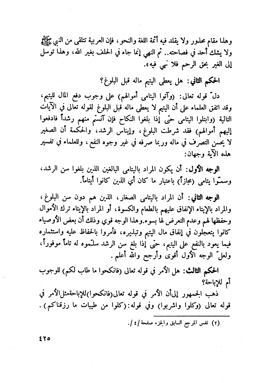 الوجه الثاني: أن المراد باليتامى الصغار، الذين هم دون سن البلوغ، والمراد بالإيتاء الإنفاق عليهم بالطعام والكسوة، أو المراد بالإيتاء ترك الأموال وحفظها لهم وعدم التعرض لها بسوء. وهذا الوجه قوي وذلك أن بعض الأوصياء كانوا يتعجلون في إنفاق مال اليتيم وتبذيره، فأمروا بالحفاظ عليه واستثماره فيما يعود بالنفع على اليتيم، حتى إذا بلغ سن الرشد سلّموه له تاماً موفوراً، ولعلّ الوجه الأول أقوى وأرجح والله أعلم.