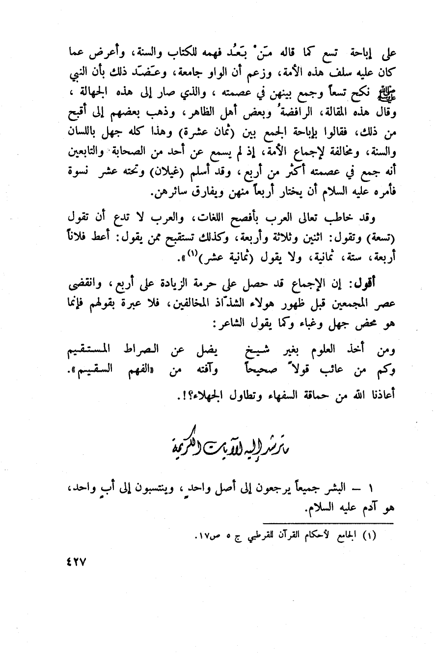 أقول: إن الإجماع قد حصل على حرمة الزيادة على أربع، وانقضى عصر المجمعين قبل ظهور هؤلاء الشذّاذ المخالفين، فلا عبرة بقولهم فإنما هو محض جهل وغباء وكما يقول الشاعر: