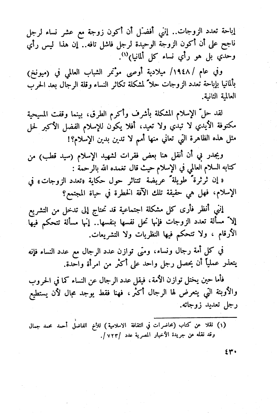 إنني أنظر فأرى كل مشكلة اجتماعية قد تحتاج إلى تدخل من التشريع إلاّ مسألة تعدد الزوجات فإنها تحل نفسها بنفسها.