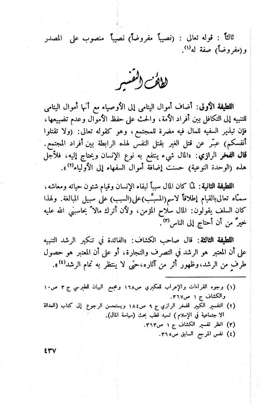 ثالثاً: قوله تعالى: {نَصِيباً مَّفْرُوضاً} نصيباً منصوب على المصدر و (مفروضاً) صفة له.