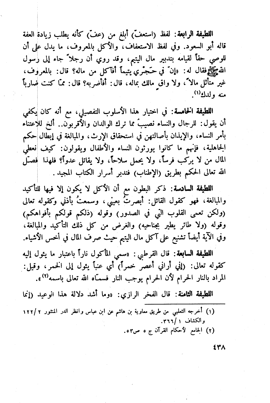 اللطيفة الرابعة: لفظ (استعفّ) أبلغ من (عفّ) كأنه يطلب زيادة العفة قاله أبو السعود. وفي لفظ الاستعفاف، والأكل بالمعروف، ما يدل على أن للوصي حقاً لقيامه بتدبير مال اليتيم، وقد روي أن رجلاً جاء إلى رسول الله صَلَّى اللَّهُ عَلَيْهِ وَسَلَّم َ فقال له: «إنّ في حجْري يتيماً أفآكل من ماله؟ قال: بالمعروف، غير متأثل مالاً، ولا واقٍ مالك بماله، قال: أفأضربه؟ قال: ممّا كنت ضارباً منه ولدك» .