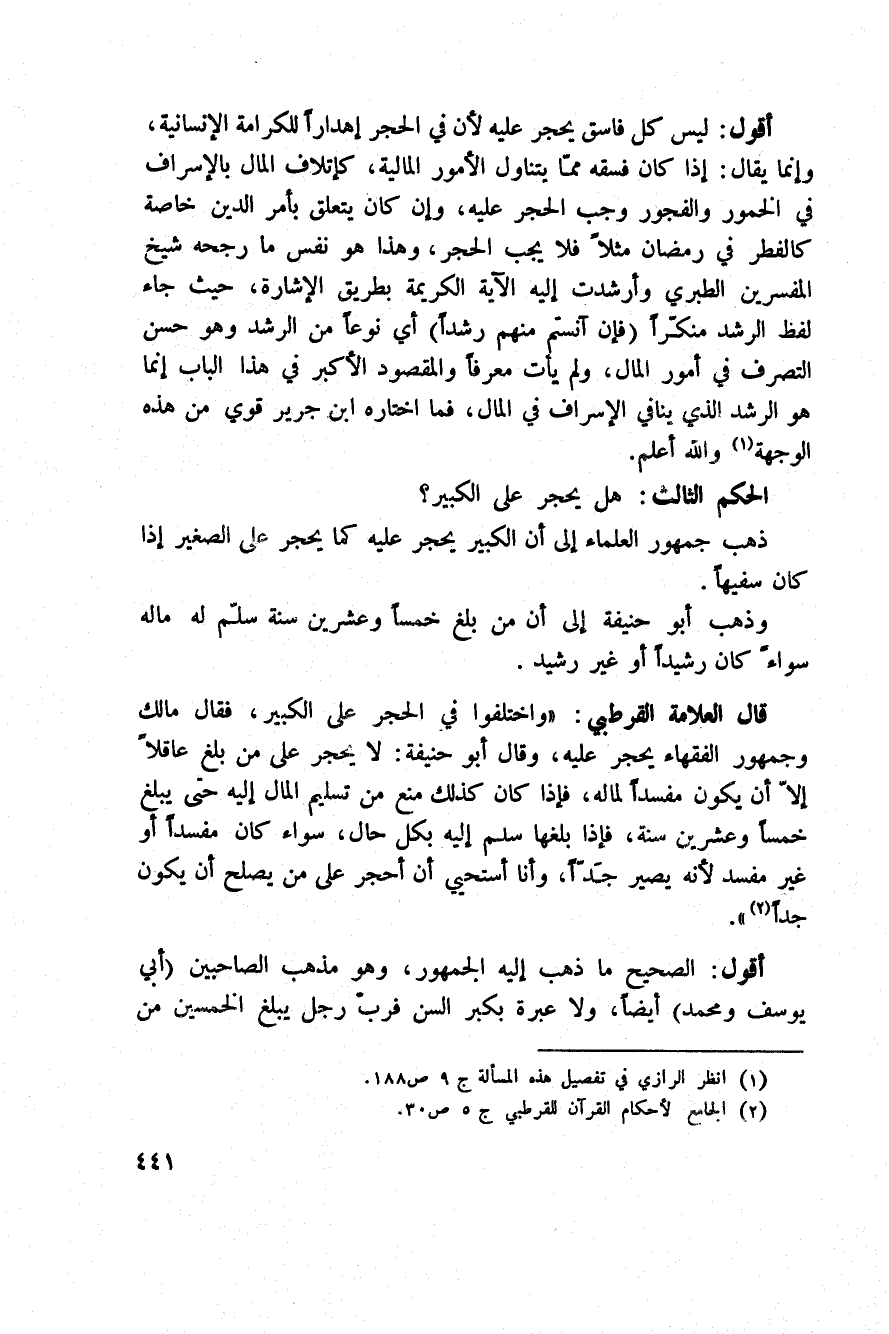 قال العلامة القرطبي: «واختلفوا في الحجر على الكبير، فقال مالك وجمهور الفقهاء يحجر عليه، وقال أبو حنيفة: لا يحجر على من بلغ عاقلاً إلاّ أن يكون مفسداً لماله، فإذا كان كذلك منع من تسليم المال إليه حتى يبلغ خمساً وعشرين سنة، فإذا بلغها سلم إليه بكل حال، سواء كان مفسداً أو غير مفسد لأنه يصير جَدّاً، وأنا أستحيي أن أحجر على من يصلح أن يكون جداً» .
