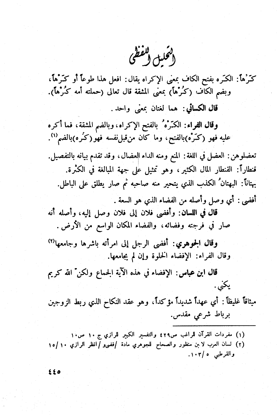 وقال الفراء: الكَرْهُ بالفتح الإكراه، وبالضم المشقة، فما أكره عليه فهو (كَرْه) بالفتح، وما كان من قبل نفسه فهو (كُره) بالضم.