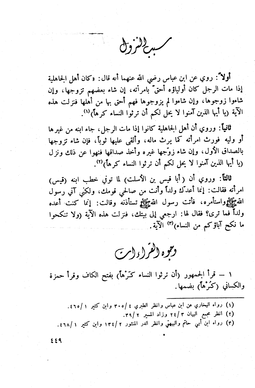 1 - قرأ الجمهور {أَن تَرِثُواْ النسآء كَرْهاً} بفتح الكاف، وقرأ حمزة والكسائي (كُرْهاً) بضمها.