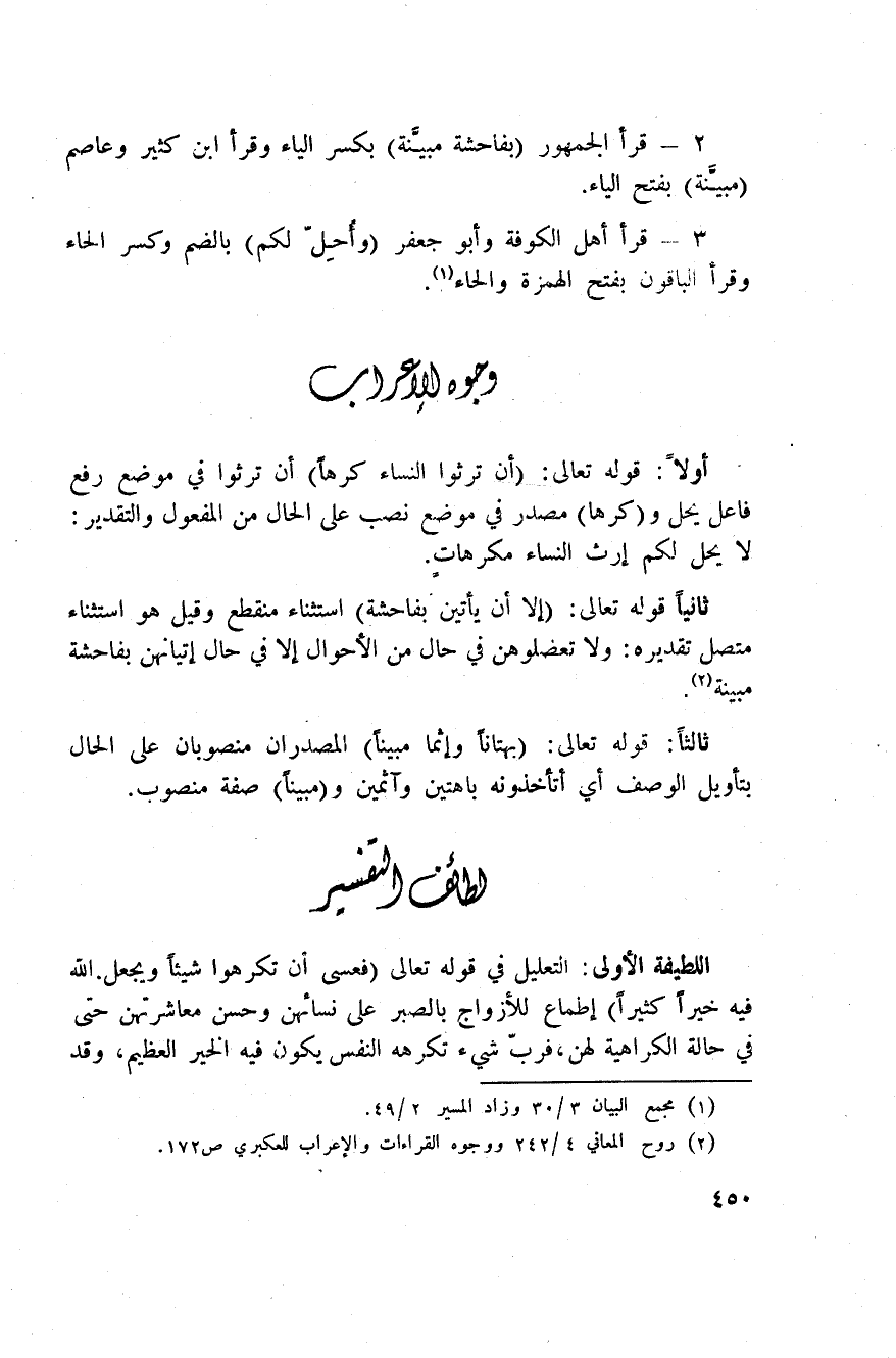 ثانياً: قوله تعالى: {إِلاَّ أَن يَأْتِينَ بِفَاحِشَةٍ} استثناء منقطع وقيل هو استثناء متصل تقديره: ولا تعضلوهن في حال من الأحوال إلا في حال إتيانهن بفاحشة مبينة.