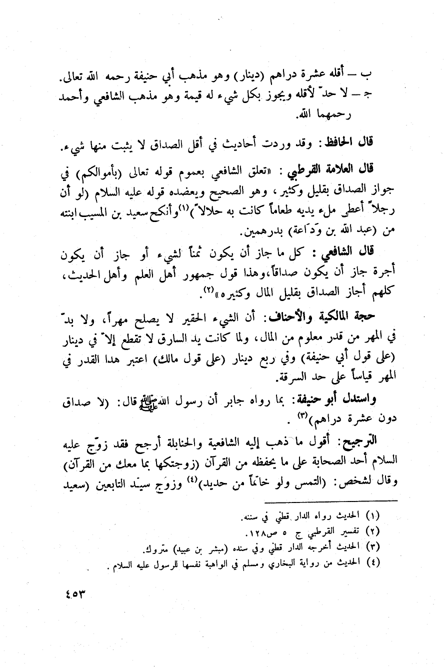 قال العلامة القرطبي: «تعلق الشافعي بعموم قوله تعالى: {بأموالكم} في جواز الصداق بقليل وكثير، وهو الصحيح ويعضده قوله عليه السلام» لو أن رجلاً أعطى ملء يديه طعاماً كانت به حلالاً «وأنكح سعيد بن المسيب ابنته من (عبد الله بن وَدَاعة) بدرهمين.