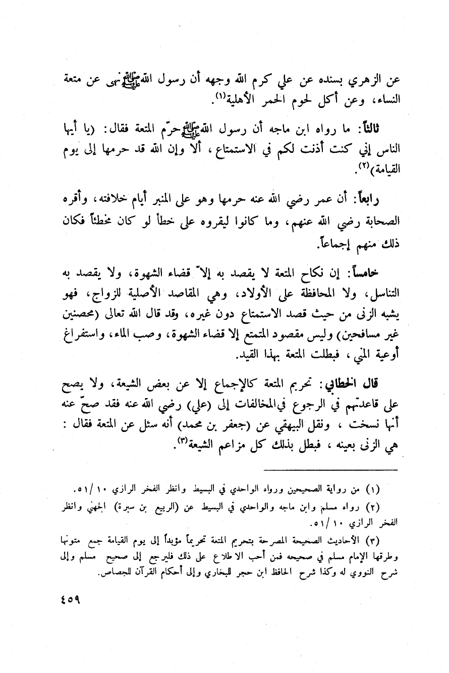 قال الخطابي: تحريم المتعة كالإجماع إلا عن بعض الشيعة، ولا يصح على قاعدتهم في الرجوع في المخالفات إلى (علي) رَضِيَ اللَّهُ عَنْه فقد صحّ عنه أنها نسخت، ونقل البيهقي عن (جعفر بن محمد) أنه سئل عن المتعة فقال: هي الزنى بعينه، فبطل بذلك كل مزاعم الشيعة.