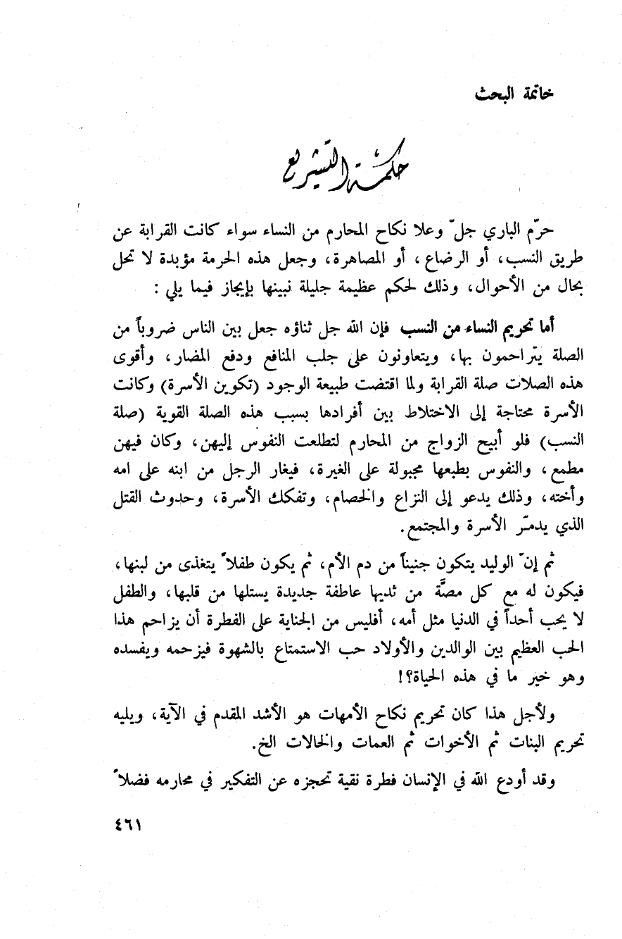 أما تحريم النساء من النسب فإن الله جل ثناؤه جعل بين الناس ضروباً من الصلة يتراحمون بها، ويتعاونون على جلب المنافع ودفع المضار، وأقوى هذه الصلات صلة القرابة ولما اقتضت طبيعة الوجود (تكوين الأسرة) وكانت الأسرة محتاجة إلى الاختلاط بين أفرادها بسبب هذه الصلة القوية (صلة النسب) فلو أبيح الزواج من المحارم لتطلعت النفوس إليهن، وكان فيهن مطمع، والنفوس بطبعها مجبولة على الغيرة، فيغار الرجل من ابنه على أمه وأخته، وذلك يدعو إلى النزاع والخصام، وتفكك الأسرة، وحدوث القتل الذي يدمّر الأسرة والمجتمع.