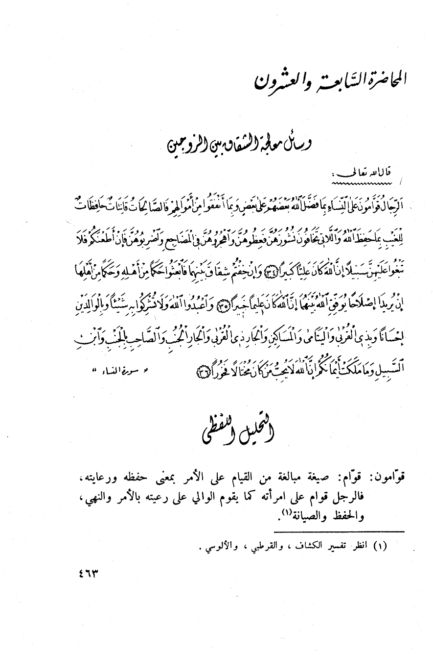 {قوامون} : قوّام: صيغة مبالغة من القيام على الأمر بمعنى حفظه ورعايته، فالرجل قوام على امرأته كما يقوم الوالي على رعيته بالأمر والنهي، والحفظ والصيانة.