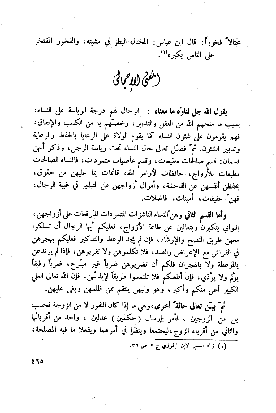 يقول الله جل ثناؤه ما معناه: الرجال لهم درجة الرياسة على النساء، بسبب ما منحهم الله من العقل والتدبير، وخصّهم به من الكسب والإنفاق، فهم يقومون على شؤون النساء كما يقوم الولاة على الرعايا بالحفظ والرعاية وتدبير الشؤون. ثمّ فصّل تعالى حال النساء تحت رياسة الرجل، وذكر أنهن قسمان: قسم صالحات مطيعات، وقسم عاصيات متمردات، فالنساء الصالحات مطيعات للأزواج، حافظات لأوامر الله، قائمات بما عليهن من حقوق، يحفظن أنفسهن عن الفاحشة، وأموال أزواجهن عن التبذير في غيبة الرجال، فهنّ عفيفات، أمينات، فاضلات.