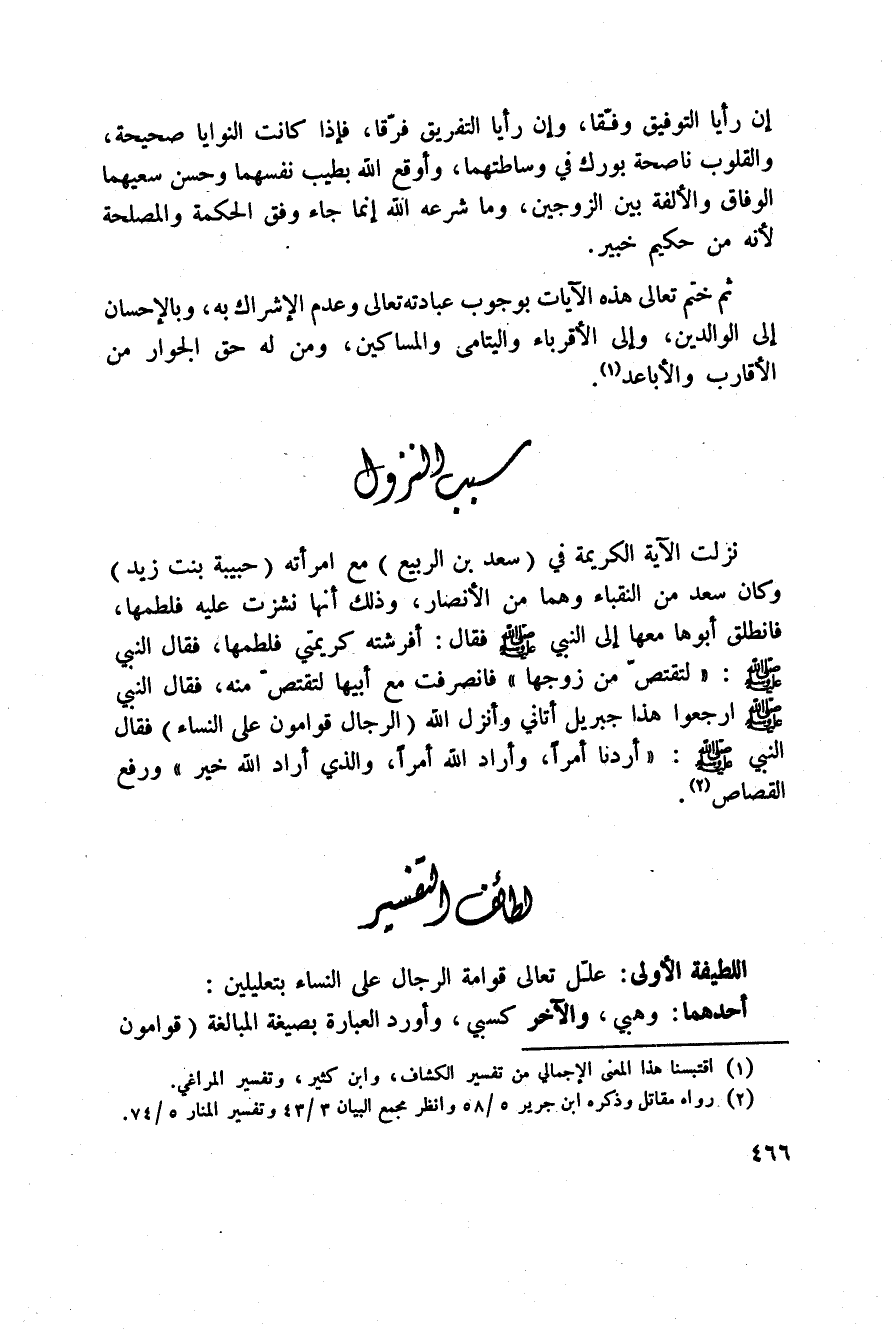 اللطيفة الأولى: علّل تعالى قوامة الرجال على النساء بتعليلين: