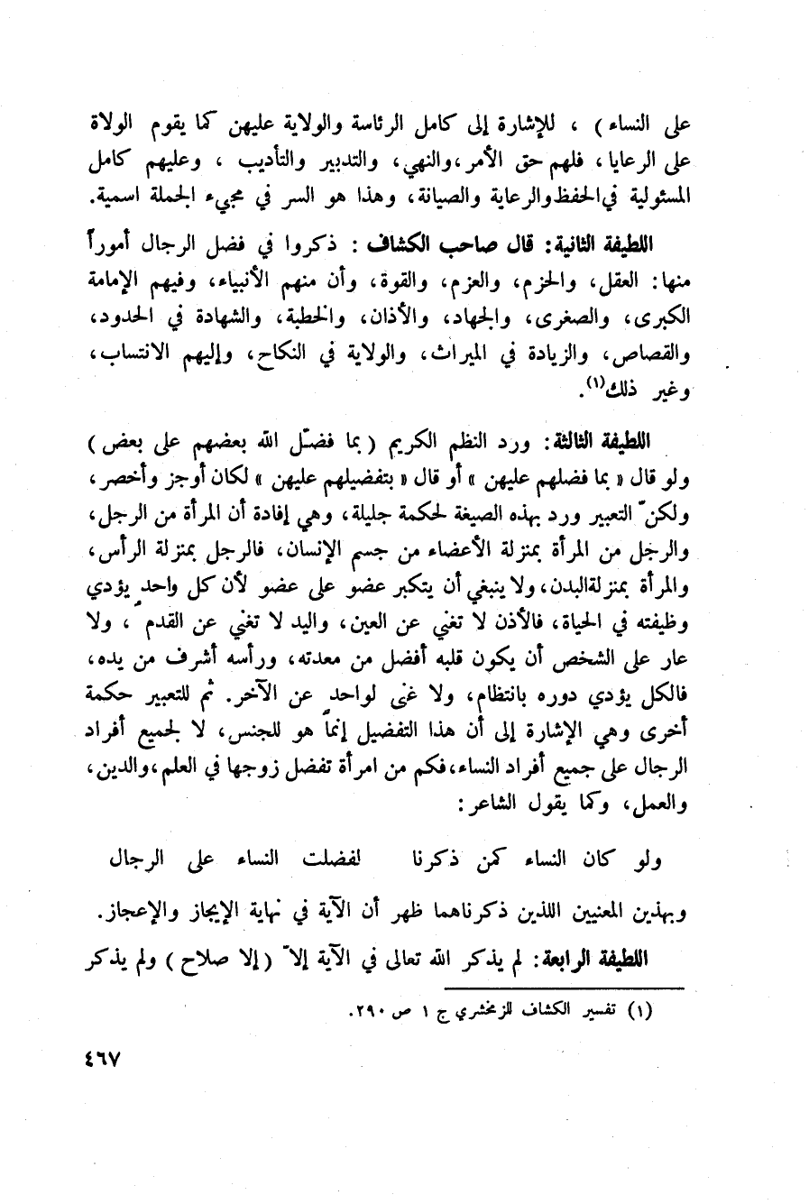 اللطيفة الثانية: قال صاحب» الكشاف «: ذكروا في فضل الرجال أموراً منها: العقل، والحزم، والعزم، والقوة، وأن منهم الأنبياء، وفيهم الإمامة الكبرى، والصغرى، والجهاد، والأذان، والخطبة، والشهادة في الحدود، والقصاص، والزيادة في الميراث، والولاية في النكاح، وإليهم الانتساب، وغير ذلك.