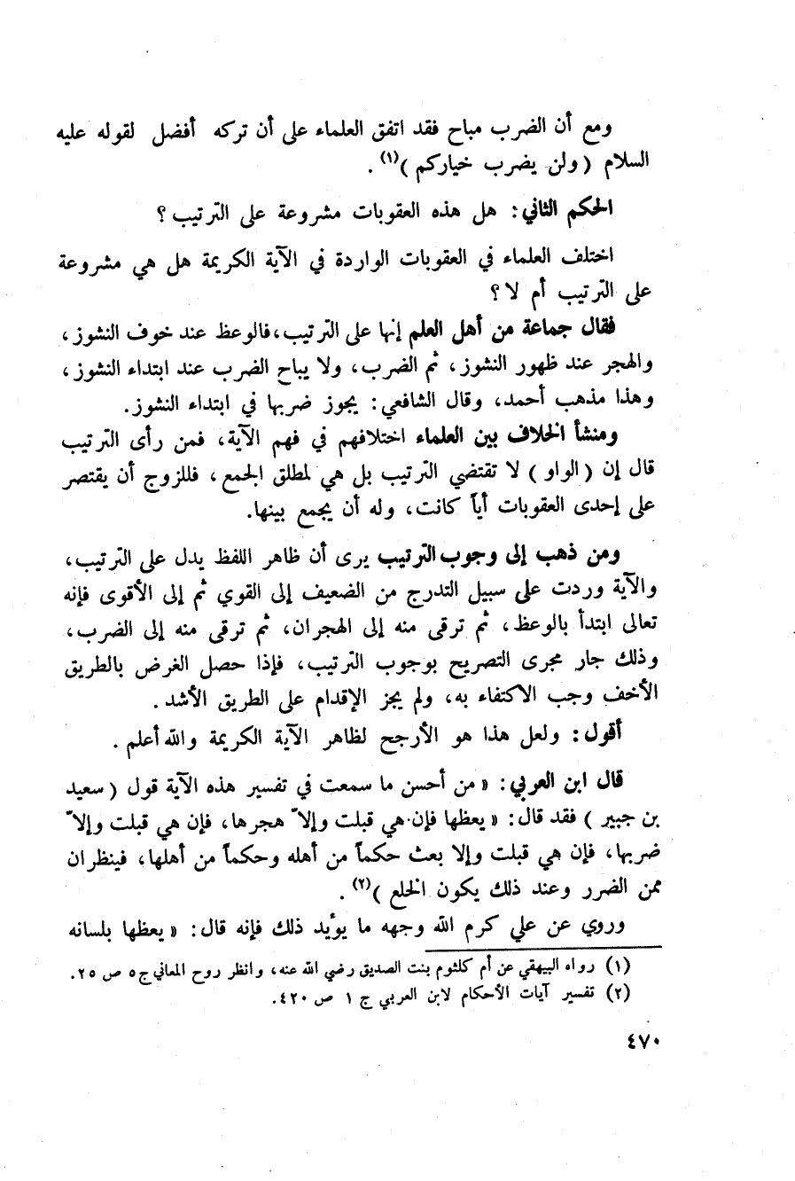 قال ابن العربي: (من أحسن ما سمعت في تفسير هذه الآية قول (سعيد بن جبير) فقد قال: «يعظها فإن هي قبلت وإلاّ هجرها، فإن هي قبلت وإلاّ ضربها، فإن هي قبلت وإلا بعث حكماً من أهله وحكماً من أهلها، فينظران ممن الضرر وعند ذلك يكون الخلع) .