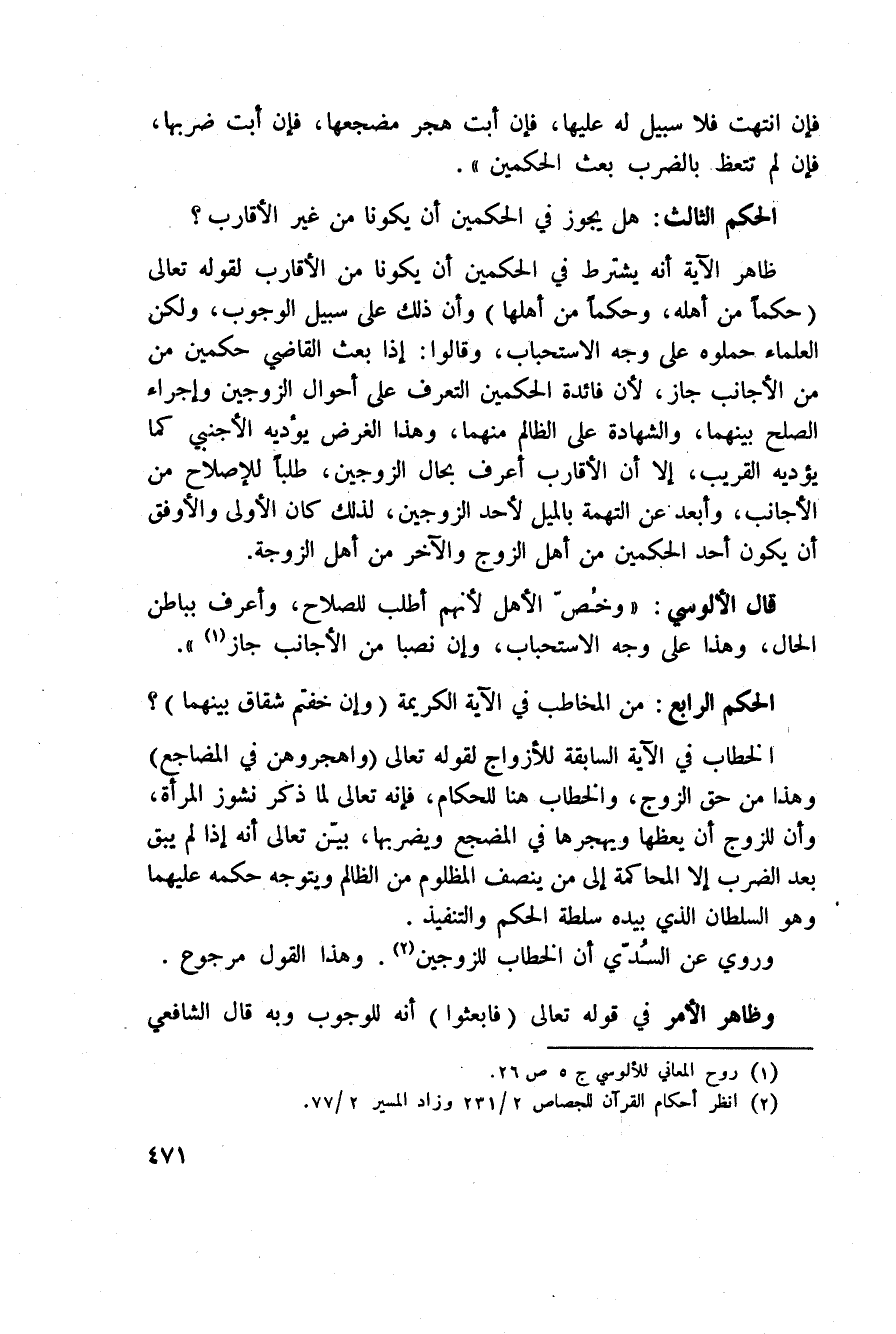 الخطاب في الآية السابقة للأزواج لقوله تعالى: {واهجروهن فِي المضاجع} وهذا من حق الزوج، والخطاب هنا للحكام، فإنه تعالى لما ذكر نشوز المرأة، وأن للزوج أن يعظها ويهجرها في المضجع ويضربها، بيّن تعالى أنه إذا لم يبق بعد الضرب إلا المحاكمة إلى من ينصف المظلوم من الظالم ويتوجه حكمه عليهما وهو السلطان الذي بيده سلطة الحكم والتنفيذ.