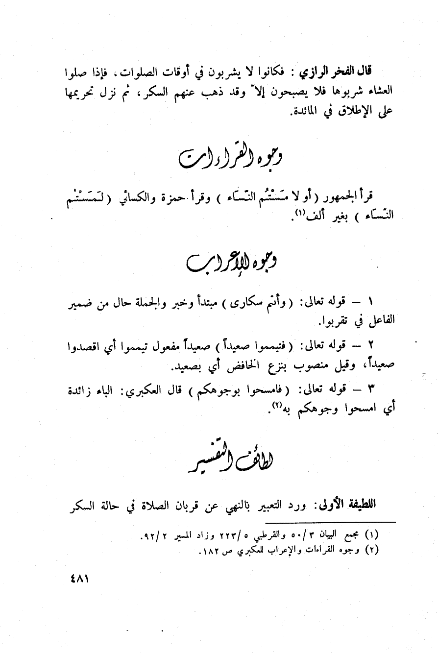 قال الفخر الرازي: فكانوا لا يشربون في أوقات الصلوات، فإذا صلوا العشاء شربوها فلا يصبحون إلاّ وقد ذهب عنهم السكر، ثم نزل تحريمها على الإطلاق في المائدة.