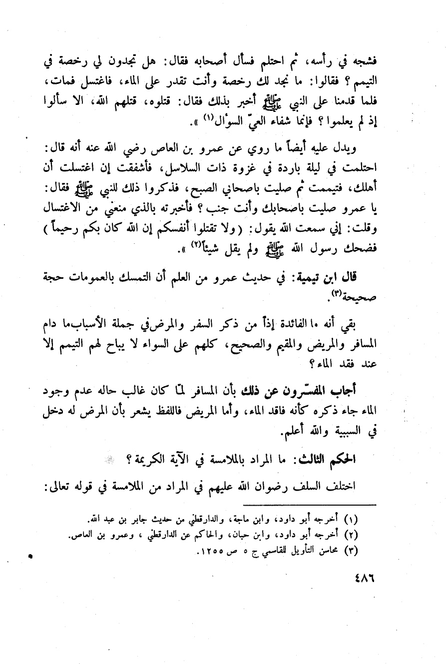 فشجه في رأسه، ثم احتلم فسأل أصحابه فقال: هل تجدون لي رخصة في التيمم؟ فقالوا: ما نجد لك رخصة وأنت تقدر على الماء، فاغتسل فمات، فلما قدمنا على النبي صَلَّى اللَّهُ عَلَيْهِ وَسَلَّم َ أخبر بذلك فقال: قتلوه، قتلهم الله، ألا سألوا إذا لم يعلموا؟ فإنما شفاء العيّ السؤال» .