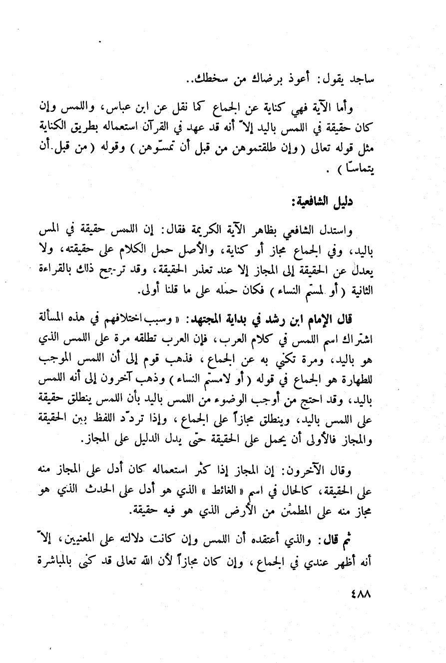 قال الإمام ابن رشد في «بداية المجتهد» : «وسبب اختلافهم في هذه المسألة اشتراك اسم اللمس في كلام العرب، فإن العرب تطلقه مرة على اللمس الذي هو بالليد، ومرة تكني به عن الجماع، فذهب قوم إلى أن اللمس الموجب للطهارة هو الجماع في قوله {أَوْ لامستم النسآء} وذهب آخرون إلى أنه اللمس باليد، وقد احتج من أوجب الوضوء من اللمس باليد بأن اللمس ينطلق حقيقة على اللمس باليد، وينطلق مجازاً على الجماع، وإذا تردّد اللفظ بين الحقيقة والمجاز، فالأولى أن يحمل على الحقيقة حتى يدل الدليل على المجاز.