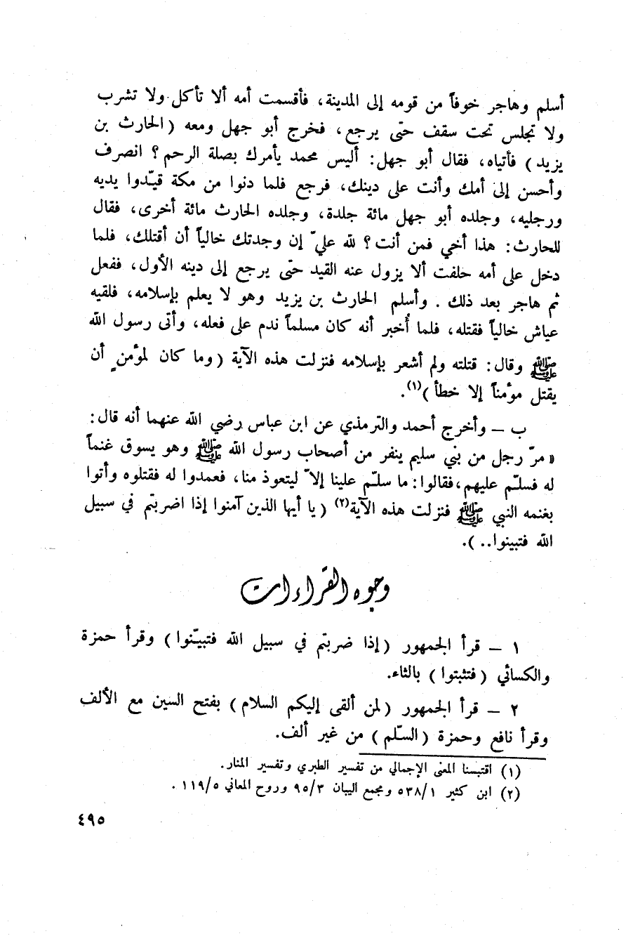 2 - قرأ الجمهور {لِمَنْ ألقى إِلَيْكُمُ السلام} بفتح السين مع الألف، وقرأ نافع وحمزة (السّلم) من غير ألف.