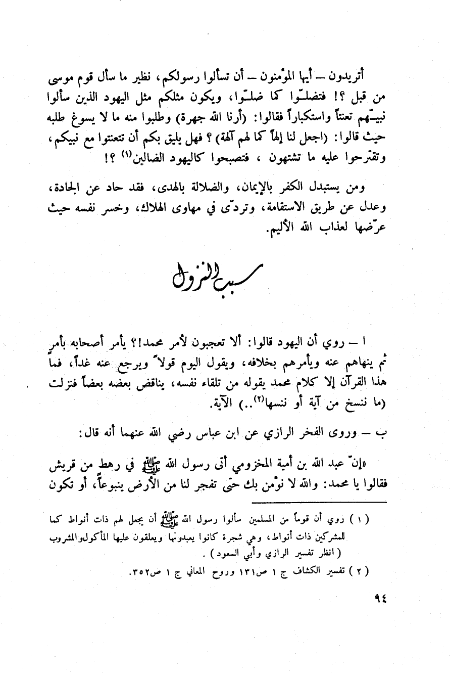أ - روي أن اليهود قالوا: ألا تعجبون لأمر محمداً؟ يأمر أصحابه بأمرٍ ثم ينهاهم عنه ويأمرهم بخلافه، ويقول اليوم قولاً ويرجع عنه غداً، فما هذا القرآن إلا كلام محمد يقوله من تلقاء نفسه، يناقض بعضه بعضاً فنزلت {مَا نَنسَخْ مِنْ آيَةٍ أَوْ نُنسِهَا ... } الآية.