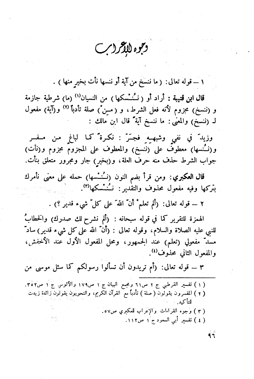 قال ابن قتيبة: أراد أو (نُنْسكها) من النسيان. (ما) شرطية جازمة و (ننسخ) مجزوم لأنه فعل الشرط، و (مِنْ) صلة تأدباً، و (آية) مفعول ل (ننسخ) والمعنى: ما ننسخ آية قال ابن مالك: