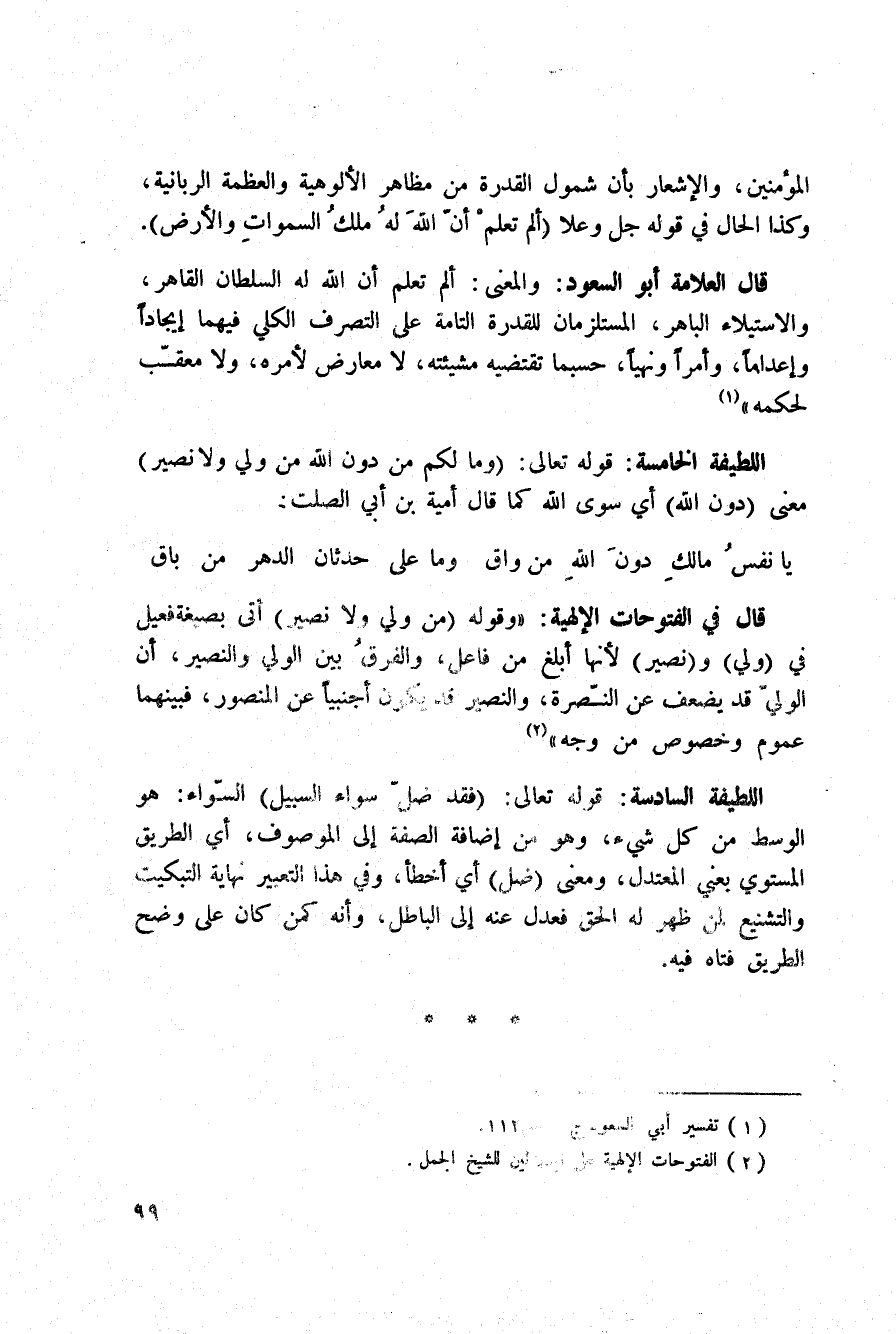 قال في» الفتوحات الإلهية «:» وقوله: {مِن وَلِيٍّ وَلاَ نَصِيرٍ} أتى بصيغة فعيل في {وَلِيٍّ} و {نَصِيرٍ} لأنها أبلغ من فاعل والفرقُ بين الولي والنصير، أن الوليّ قد يضعف عن النّصرة، والنصير قد يكون أجنبياً عن المنصور، فبينهما عموم وخصوص من وجه «.