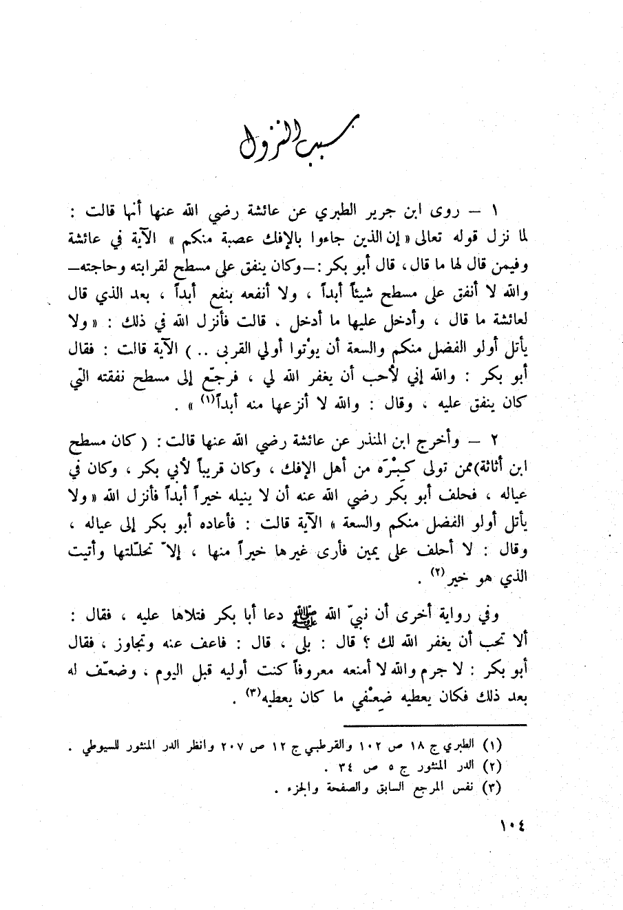 2 - وأخرج ابن المنذر عن عائشة رَضِيَ اللَّهُ عَنْها قالت: (كان مسطح بن أثاثة) ممن تولى كِبْرَه أهل الإفك، وكان قريباً لأبي بكر، وكان في عياله، فحلف أبو بكر رَضِيَ اللَّهُ عَنْه أن لا ينيله خيراً أبداً فأنزل الله {وَلاَ يَأْتَلِ أُوْلُواْ الفضل مِنكُمْ والسعة} الآية قالت: فأعاده أبو بكر إلى عياله، وقال: لا أحلف على يمين فأرى غيرها خيراً منها، إلاّ تحلّلتها وأتيت الذي هو خير.