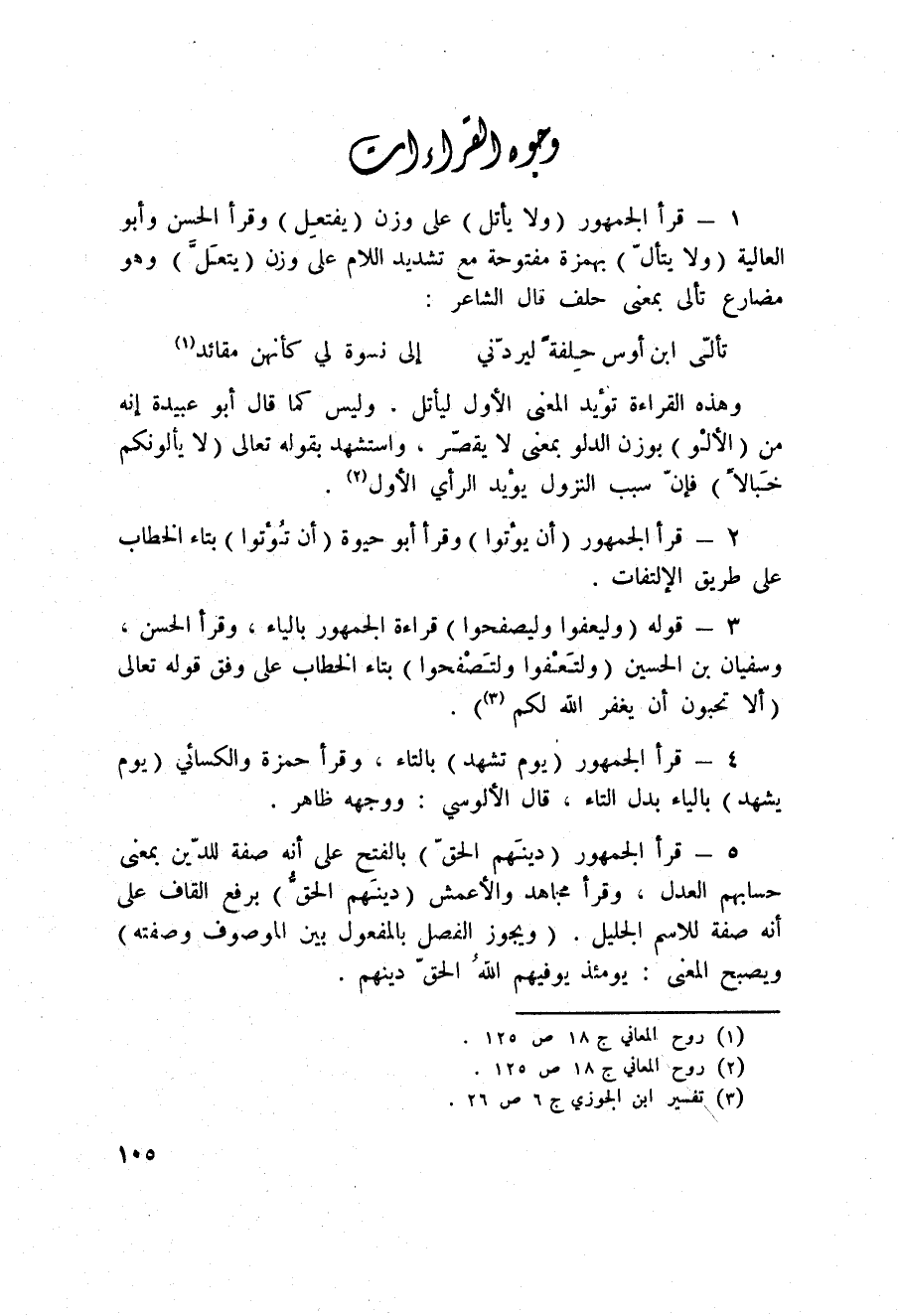 1 - قرأ الجمهور {ولا يأتل} على وزن (يفتعِل) وقرأ الحسن وأبو العالية {ولا يتألّ} بهمزة مفتوحة مع تشديد اللام على وزن (يتعَلَّ) وهو مضارع تألى بمعنى حلف قال الشاعر: