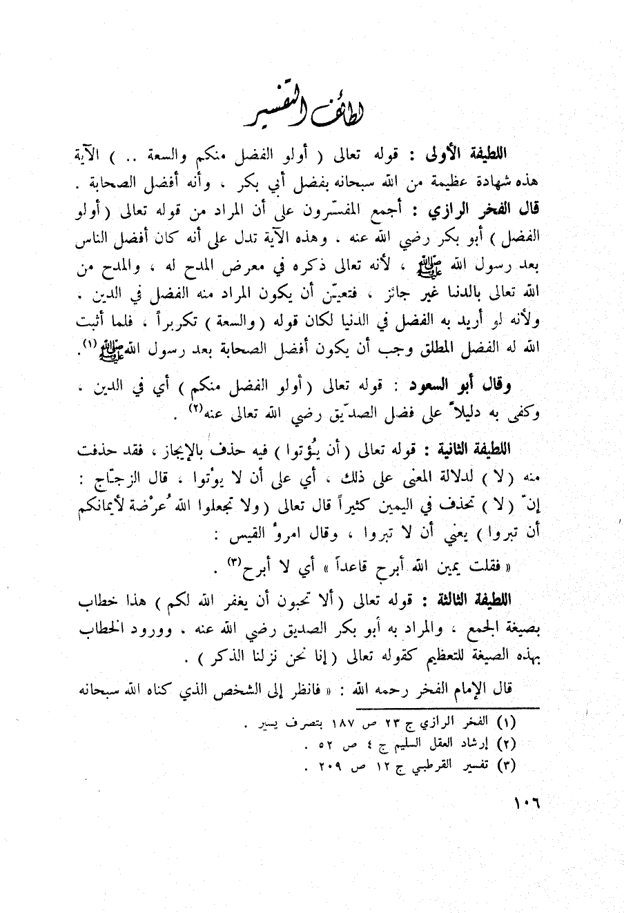 اللطيفة الأولى: قوله تعالى: {أُوْلُواْ الفضل مِنكُمْ والسعة ... } الآية هذه شهادة عظيمة من الله سبحانه بفضل أبي بكر، وأنه أفضل الصحابة.