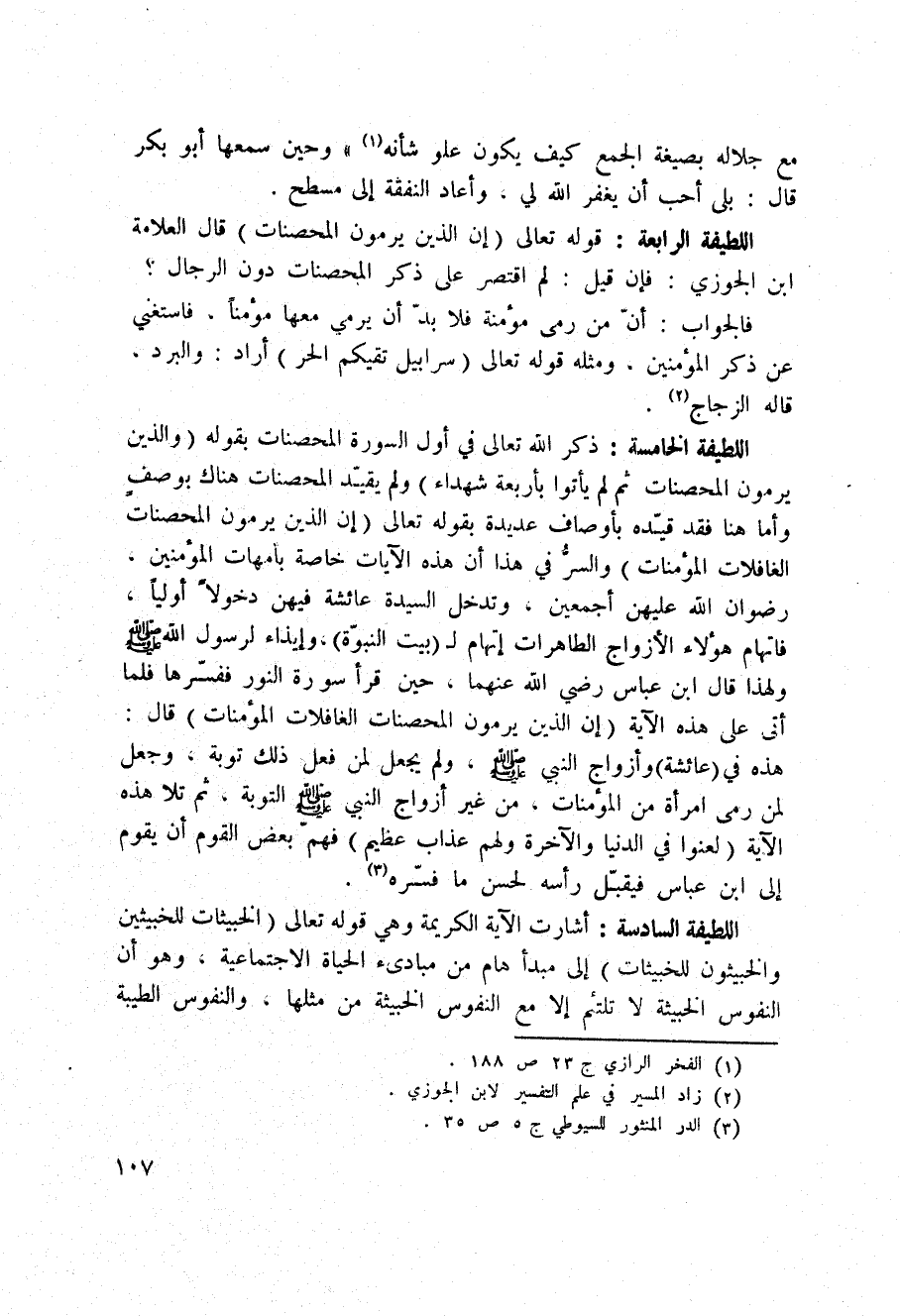 اللطيفة الخامسة: ذكر الله تعالى في أول السورة المحصنات بقوله: {والذين يَرْمُونَ المحصنات ثُمَّ لَمْ يَأْتُواْ بِأَرْبَعَةِ شُهَدَآءَ} [النور: 4] ولم يقيّد المحصنات هناك بوصفٍ وأما هنا فقد قيّده بأوصاف عديدة بقوله تعالى: {إِنَّ الذين يَرْمُونَ المحصنات الغافلات المؤمنات} والسرُّ في هذا أن هذه الآيات خاصة بأمهات المؤمنين، رضوان الله عليهن أجمعين، وتدخل السيدة عائشة فيهن دخولاً أولياً، فاتهام هؤلاء الأزواج الطاهرات إتهام ل (بيت النبوّة) ، وإيذاء لرسول الله صَلَّى اللَّهُ عَلَيْهِ وَسَلَّم َ؛ ولهذا قال ابن عباس رَضِيَ اللَّهُ عَنْهما، حين قرأ سورة النور ففسّرها فلما أتى على هذه الآية {إِنَّ الذين يَرْمُونَ المحصنات الغافلات المؤمنات} قال: هذه في (عائشة) وأزواج النبي صَلَّى اللَّهُ عَلَيْهِ وَسَلَّم َ، ولم يجعل لمن فعل ذلك توبة، وجعل لمن رمى امرأة من المؤمنات، من غير أزواج النبي صَلَّى اللَّهُ عَلَيْهِ وَسَلَّم َ التوبة، ثم تلا هذه الآية {لُعِنُواْ فِي الدنيا والآخرة وَلَهُمْ عَذَابٌ عَظِيمٌ} فهمّ بعض القوم أن يقوم إلى ابن عباس فيقبّل رأسه لحسن ما فسّره.
