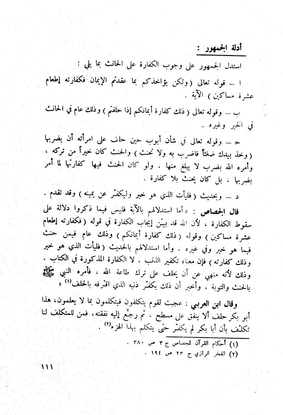 قال الجصاص: «أم استدلالهم بالآية فليس فيما ذكروا دلالة على سقوط الكفارة، لأن الله قد بيّن إيجاب الكفارة في قوله: {فَكَفَّارَتُهُ إِطْعَامُ عَشَرَةِ مَسَاكِينَ} وقوله: {ذلك كَفَّارَةُ أَيْمَانِكُمْ} [المائدة: 89] وذلك عام فيمن حنث فيما هو خير وفي غيره، وأما استدلالهم بالحديث» فليأت الذي هو خير وذلك كفارته «فإن معناه تكفير الذنب. لا الكفارة المذكورة في الكتاب، وذلك لأنه منهي عن أن يحلف على ترك طاعة الله. فأمر النبي صَلَّى اللَّهُ عَلَيْهِ وَسَلَّم َ بالحنث والتوبة، وأخبر أن ذلك يكفّر ذنبه الذي اقترفه بالحلف» .