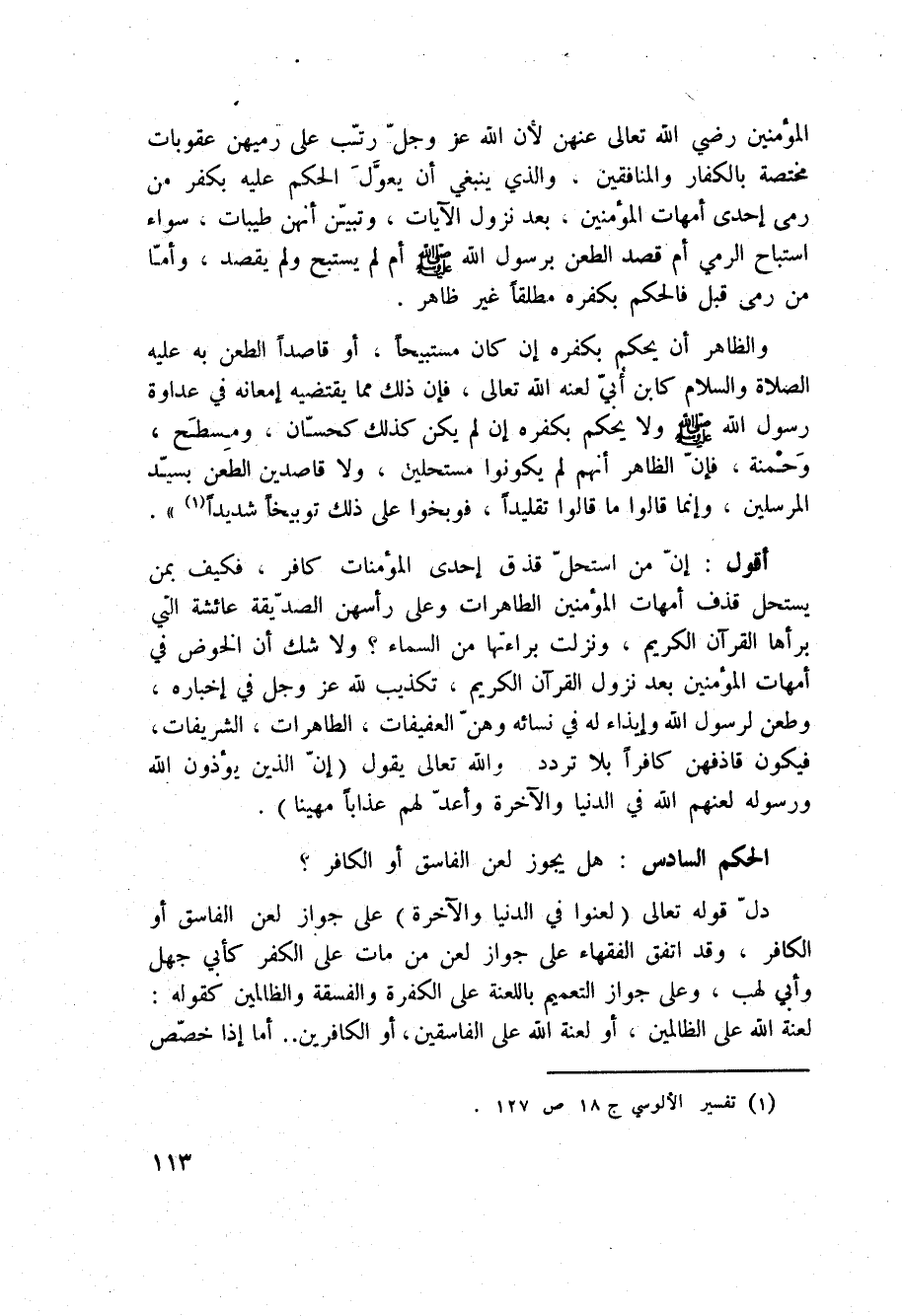 المؤمنين رضي الله تعالى عنهن لأن الله عَزَّ وَجَلَّ ّ رتّب على رميهن عقوبات مختصة بالكفار والمنافقين، والذي ينبغي أن يعوِّلَ الحكم عليه بكفر من رمى إحدى أمهات المؤمنين، بعد نزول الآيات، وتبيّن أنهن طيبات، سواء استباح الرمي أم قصد الطعن برسول الله صَلَّى اللَّهُ عَلَيْهِ وَسَلَّم َ أم لم يستبح ولم يقصد، وأمّا من رمى قبل فالحكم بكفره مطلقاً غير ظاهر.