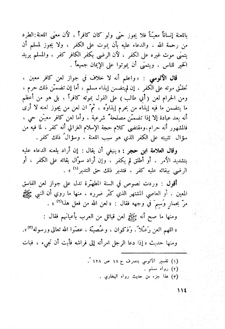 قال الألوسي: «واعلم أنه لا خلاف في جواز لعن كافر معين، تحقّق موته على الكفر، إن لم يتضمن إيذاء مسلم، أما إن تضمّن ذلك حرم، ومن الحرام لعن (أبي طالب) على القول بموته كافراً، بل هو من أعظم ما يتضمن ما فيه إيذاء من يحرم إيذاؤه، ثمّ أن لعن من يجوز لعنه لا أرى أنه يعد عبادة إلا إذا تضمّن مصلحةً شرعية، وأما لعن كافر معيّن حي، فالمشهور أنه حرام، ومقتضى كلام حجة الإسلام الغزالي أنه كفر، لما فيه من سؤال تثبيته على الكفر الذي هو سبب اللعنة، وسؤالُ ذلك كفر» .