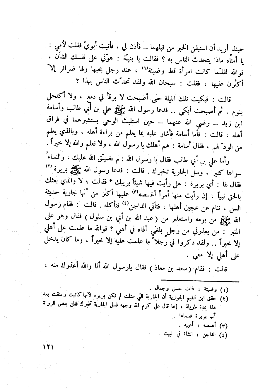 حينئذٍ أريد أن استيقن الخبر من قبلهما - فأذن لي، فأتيت أبويّ فقلت لأمي: يا أمتاه ماذا يتحدث الناس به؟ فقالت يا بنيّة: هوّني على نفسك الشأن، فوالله لقلّما كانت امرأة قط وضيئة، عند رجل يحبها ولها ضرائر إلاّ أكثرن عليها، فقلت: سبحان الله ولقد تحدّث الناس بهذا؟