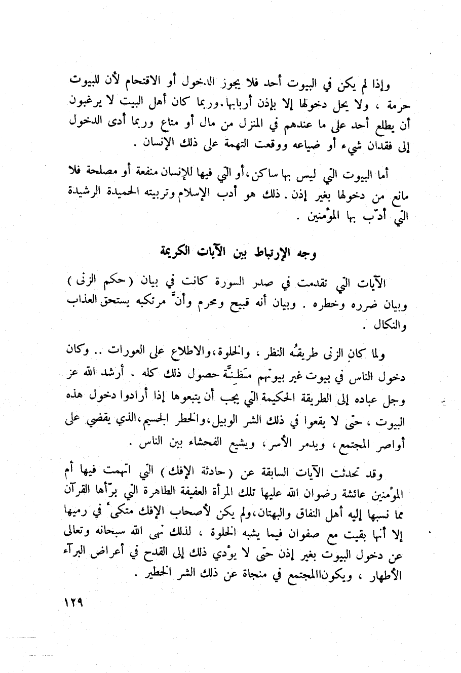 وقد تحدثت الآيات السابقة عن (حادثة الإفك) التي اتهمت فيها أم المؤمنين عائشة رضوان الله عليها تلك المرأة العفيفة الطاهرة التي برّأها القرآن مما نسبها إليه أهل النفاق والبهتان، ولم يكن لأصحاب الإفك متكأ في رميها إلا أنها بقيت مع صفوان فيما يشبه الخلوة، لذلك نهى الله سبحانه وتعالى عن دخول البيوت بغير إذن حتى لا يؤدي ذلك إلى القدح في أعراض البرآء الأطهار، ويكون المجتمع في منجاة عن ذلك الشر الخطير.