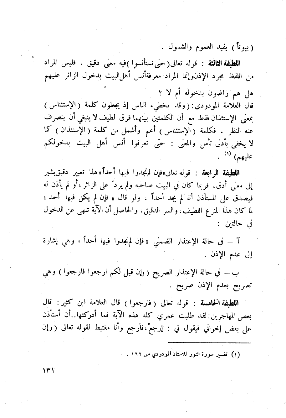 اللطيفة الخامسة: قوله تعالى {فارجعوا} قال العلامة ابن كثير: قال بعض المهاجرين: لقد طلبت عمري كله هذه الآية فما أدركتها ... أن أستأذن على بعض إخواني فيقول لي: إرجعْ، فأرجع وأنا مغتبط لقوله تعالى: {وَإِن