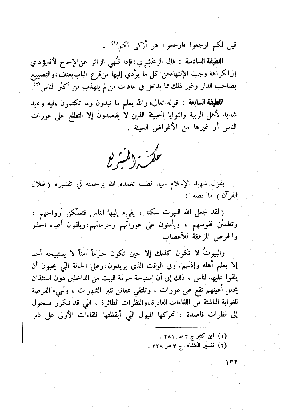 (لقد جعل الله البيوت سكنا، يفيء إليها الناس فتسْكن أرواحهم، وتطمئن نفوسهم، ويأمنون على عوراتهم وحرماتهم، ويلقون أعباء الحذر والحرص المرهقة للأعصاب) .