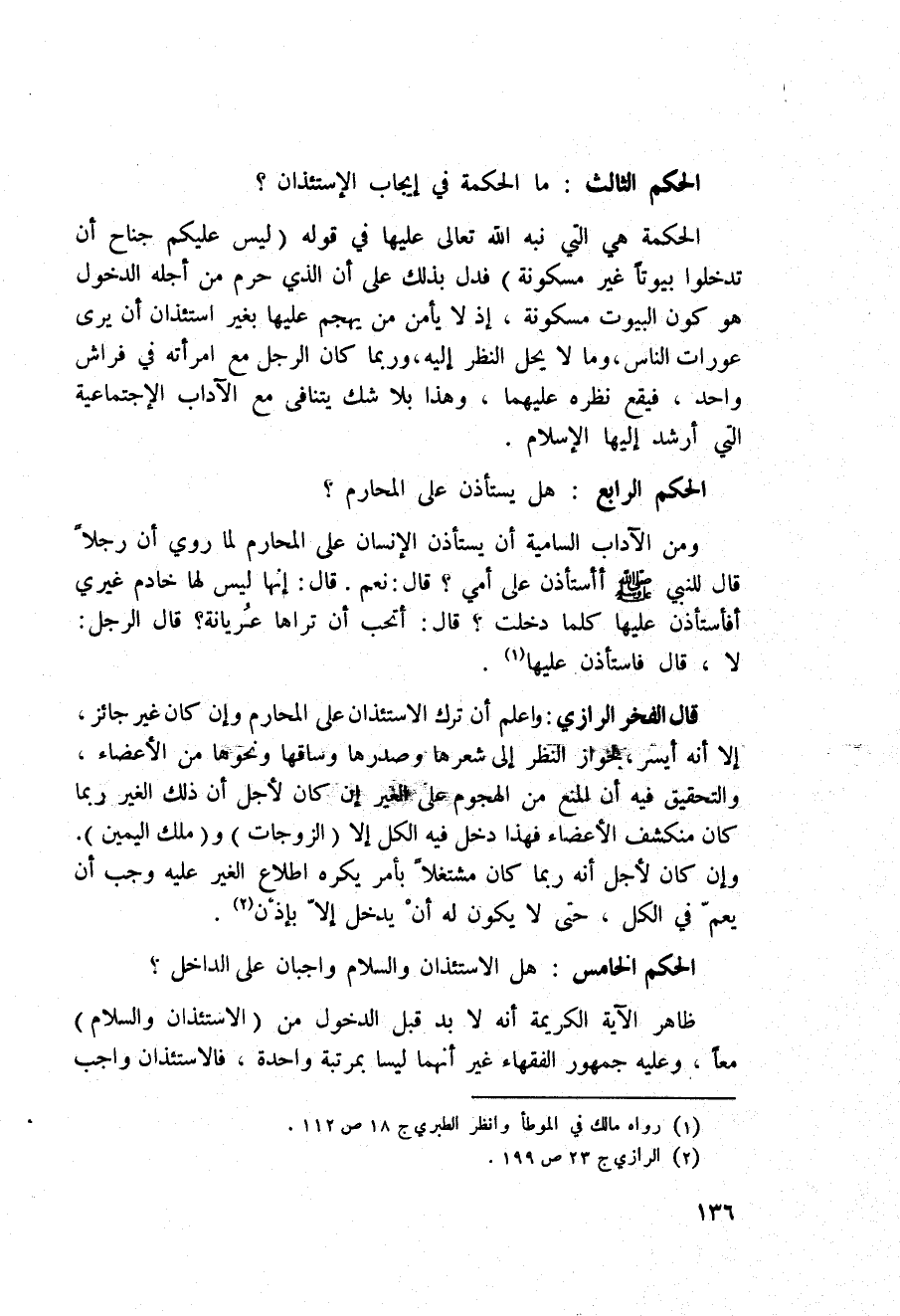 ومن الآداب السامية أن يستأذن الإنسان على المحارم لما روي أن رجلاً قال للنبي صَلَّى اللَّهُ عَلَيْهِ وَسَلَّم َ أأستأذن على أمي؟ قال: نعم، قال: إنها ليس لها خادم غير أفأستأذن عليها كما دخلت؟ قال: أتحب أن تراها عُريانة؟ قال الرجل: لا، قال فاستأذن عليها.