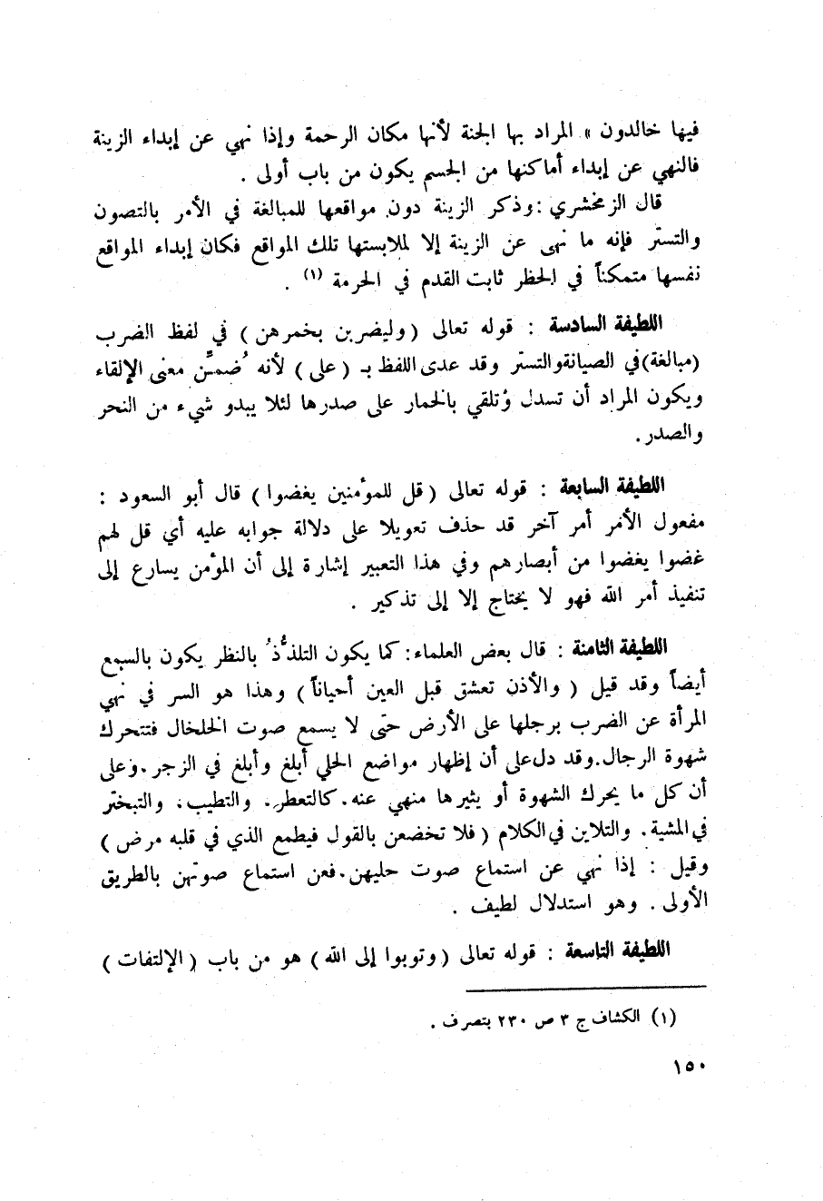 اللطيفة الثامنة: قال بعض العلماء: كما يكون التلذُّذ بالنظر يكون بالسمع أيضاً وقد قيل (والأذن تعشق قبل العين أحياناً) وهذا هو السر في نهي المرأة عن الضرب برجلها على الأرض حتى لا يسمع صوت الخلخال فتتحرك شهوة الرجال.