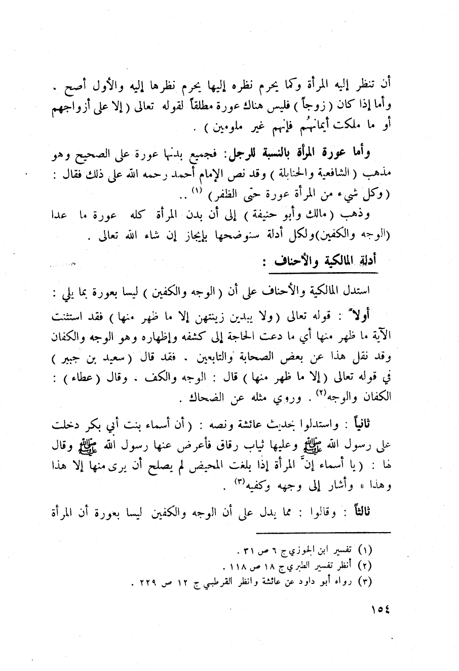 وذهب (مالك وأبو حنيفة) إلى أن بدن المرأة كله عورة ما عدا (الوجه والكفين) ولكل أدلة سنوضحها بإيجاز إن شاء الله تعالى.