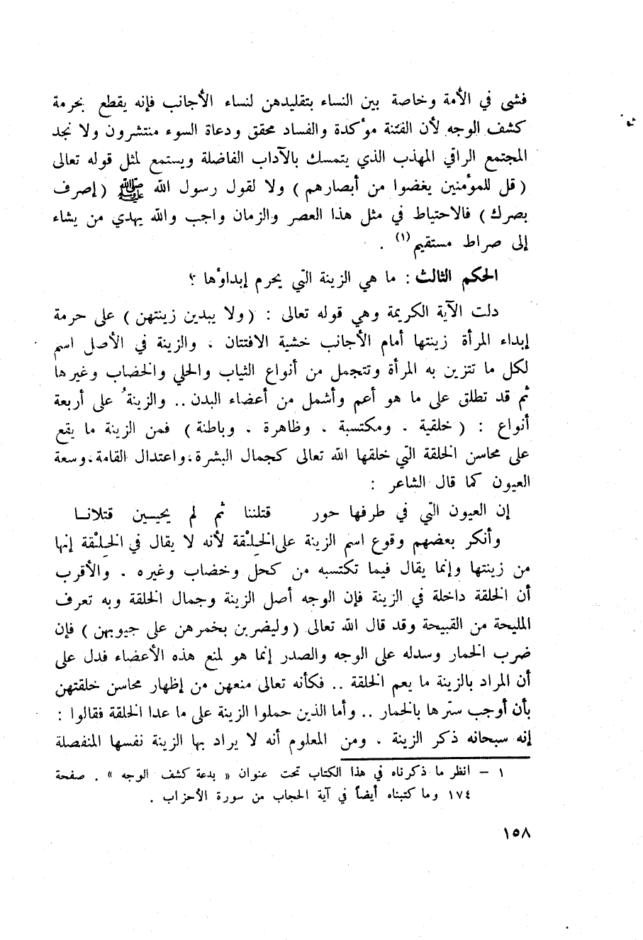 فشى في الأمة وخاصة بين النساء بتقليدهن لنساء الأجانب، فإنه يقطع بحرمة كشف الوجه لأن الفتنة مؤكدة والفساد محقق ودعاء السوء منتشرون، ولا نجد المجتمع الراقي المهذب الذي يتمسك بالآداب الفاضلة ويستمع لمثل قوله تعالى: {قُلْ لِّلْمُؤْمِنِينَ يَغُضُّواْ مِنْ أَبْصَارِهِمْ} ولا لقول رسول الله صَلَّى اللَّهُ عَلَيْهِ وَسَلَّم َ «إصرف بصرك» فالاحتياط في مثل هذا العصر والزمان واجب والله يهدي من يشاء إلى صراط مستقيم.