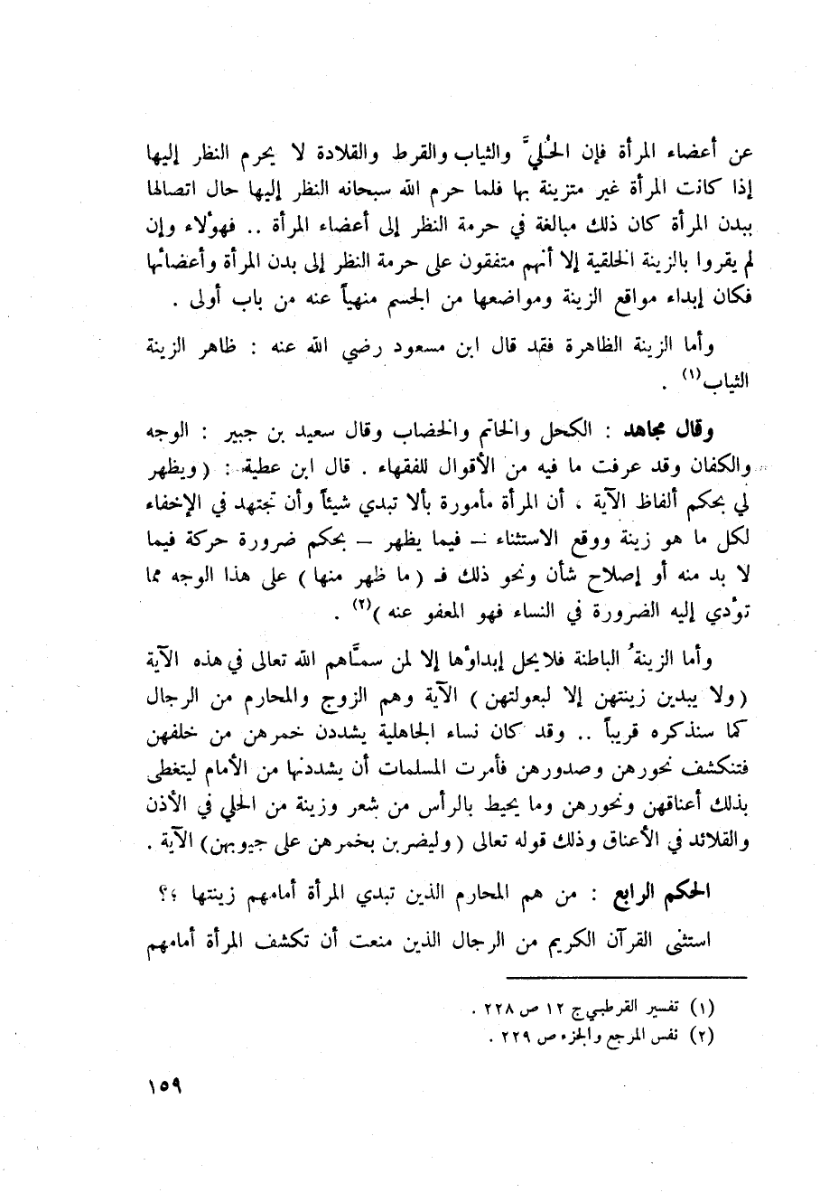 عن أعضاء المرأة فإن الحُليَّ والثياب والقرط والقلادة لا يحرم النظر إليها إذا كانت المرأة غير متزينة فلما حرم الله سبحانه النظر إليها حال اتصالها ببدن الخلقية إلا أنهم متفقون على حرمة النظر إلى بدن المرأة وأعضائها فكان إبداء مواقع الزينة ومواضعها من الجسم منهياً عنه من باب أولى.
