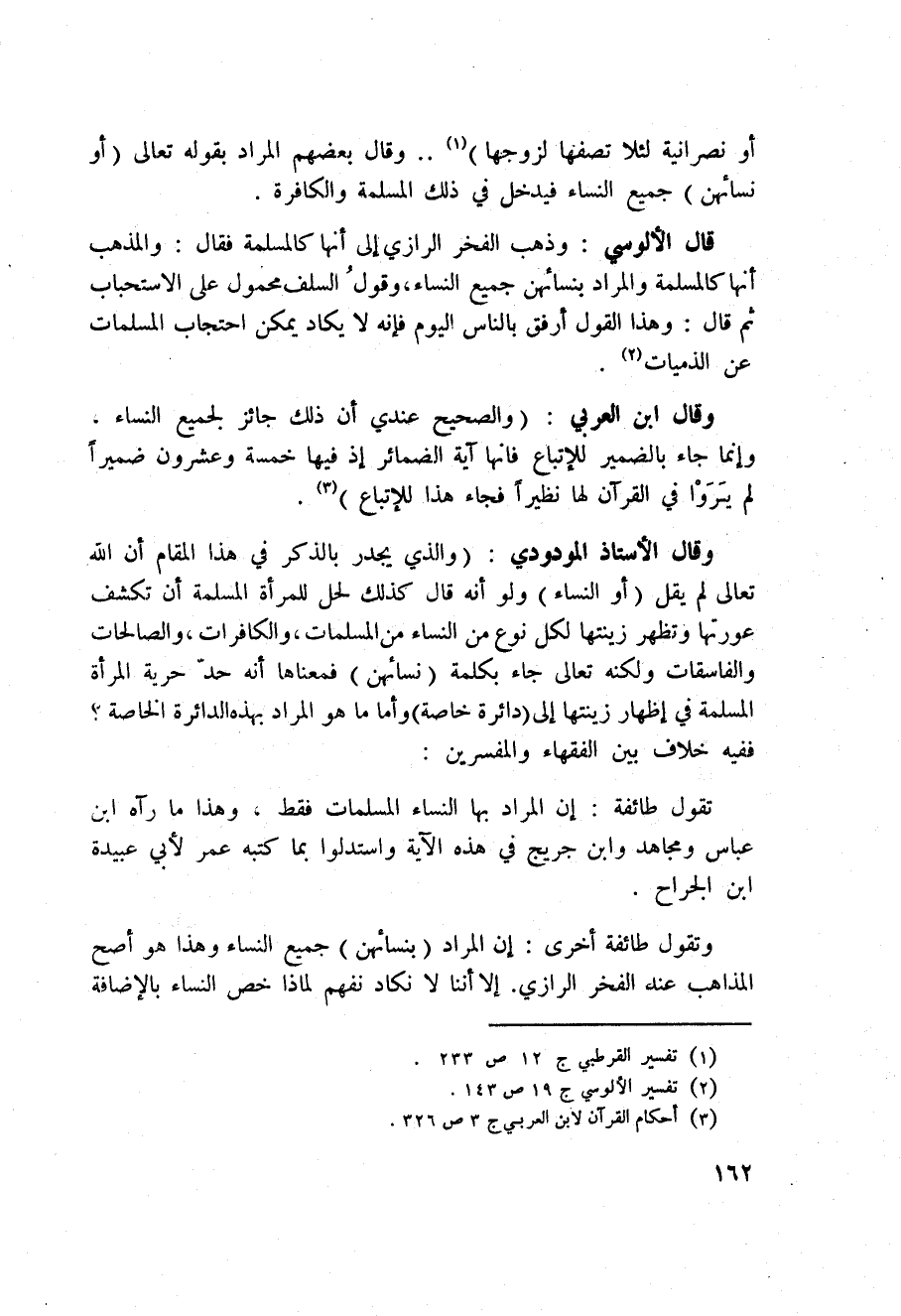وقال الأستاذ المودودي: والذي يجدر بالذكر في هذا المقام أن الله تعالى لم يقل (أو النساء) ولو أنه قال كذلك لحل للمرأة المسلمة أن تكشف عورتها وتظهر زينتها لكل نوع من النساء من المسلمات، والكافرات، والصالحات والفاسقات ولكنه تعالى جاء بكلمة {نِسَآئِهِنَّ} فمعناها أنه حدّ حرية المرأة المسلمة في إظهار زينتها إلى (دائرة خاصة) ، وأما ما هو المراد بهذه الدائرة الخاصة؟ ففيه خلاف بين الفقهاء والمفسرين؟