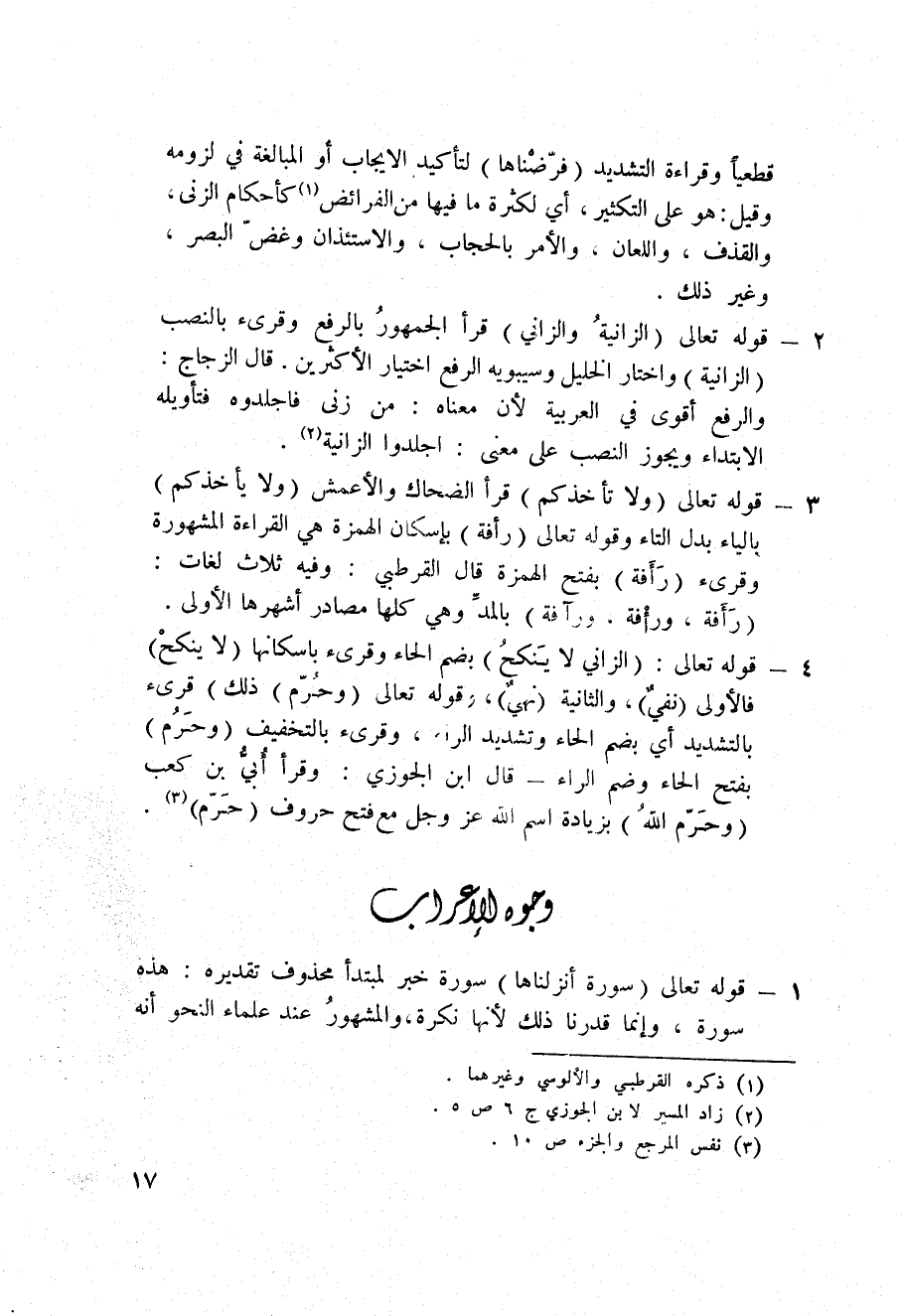 3 - قوله تعالى: {وَلاَ تَأْخُذْكُمْ} قرأ الضحاك والأعمش {ولا يأخذكم} بالياء بدل التاء وقوله تعالى: {رَأْفَةٌ} بإسكان الهمزة هي القراءة المشهور وقرئ {رَأَفة} بفتح الهمزة قال القرطبي: وفيه ثلاث لغات: (رَأَفة، ورأْفة، ورآفة) بالمد وهي كلها مصادر أشهرها الأولى.