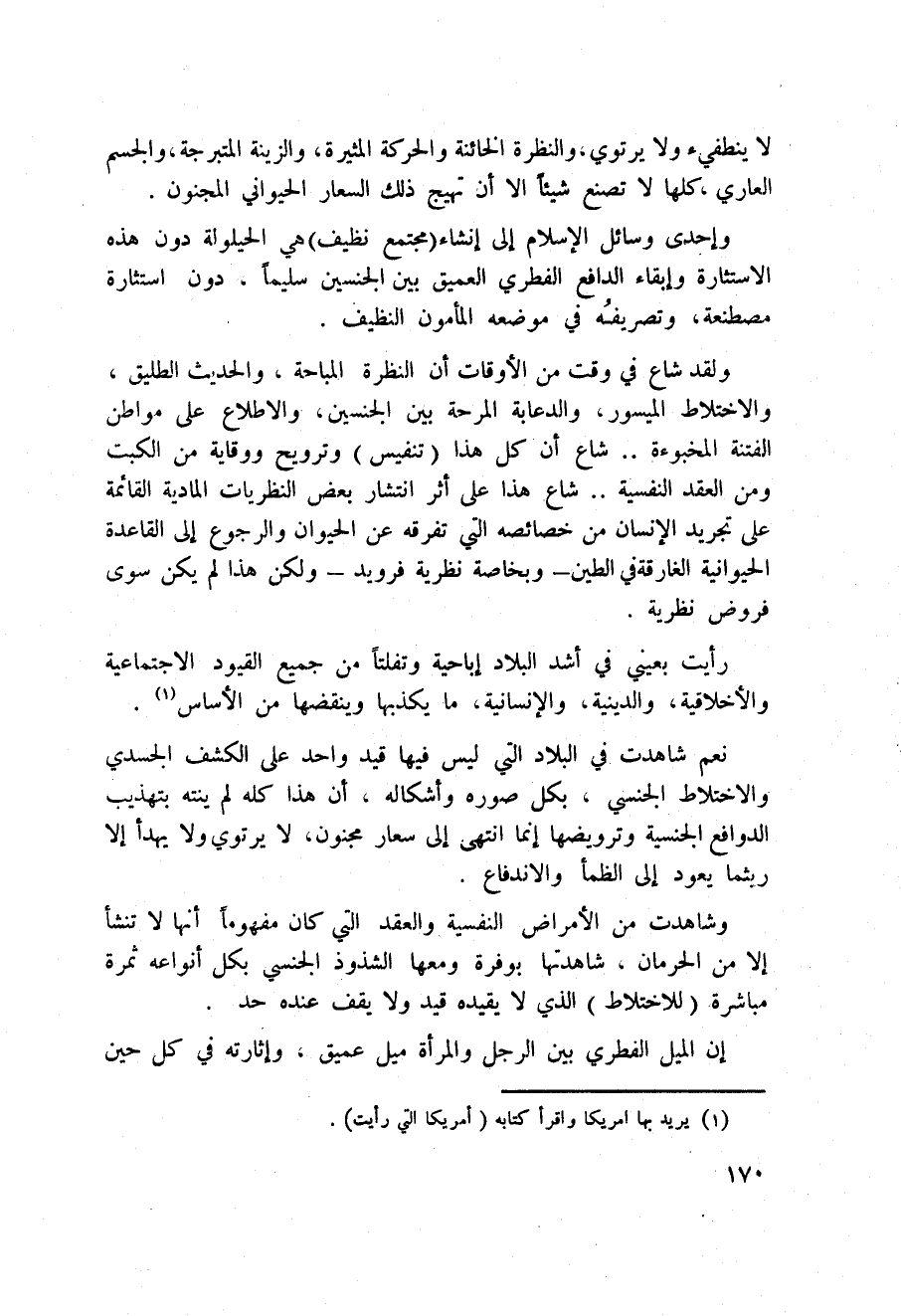 نعم شاهدت في البلاد التي ليس فيها قيد واحد على الكشف الجسدي والاختلاط الجنسي، بكل صوره وأشكاله، أن هذا كله لم ينته بتهذيب الدوافع الجنسية وترويضها إنما انتهى إلى سعار مجنون، لا يرتوي ولا يهدأ إلا ريثما يعود إلى الظمأ والاندفاع.