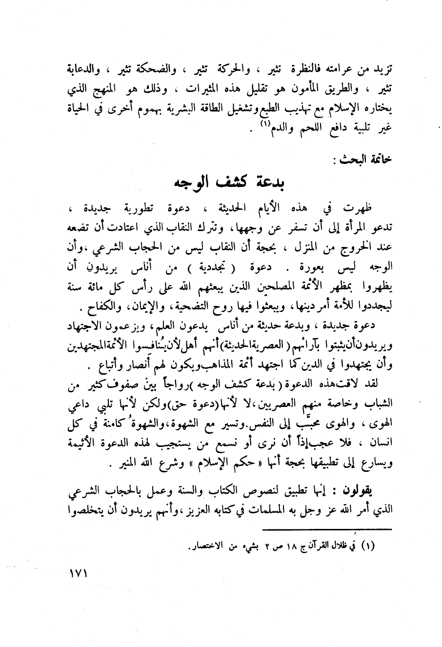 ظهرت في هذه الأيام الحديثة، دعوة تطورية جديدة، تدعو المرأة إلى أن تسفر عن وجهها، وتترك النقاب الذي اعتادت أن تضعه عند الخروج من المنزل، بحجة أن النقاب ليس من الحجاب الشرعي، وأن الوجه ليس بعورة. دعوة (تجددية) من أناس يريدون أن يظهروا بمظهر الأئمة المصلحين الذين يبعثهم الله على رأس كل مائة سنة ليجددوا للأمة أمر دينها، ويبعثوا فيها روح التضحية، والإيمان، والكفاح.