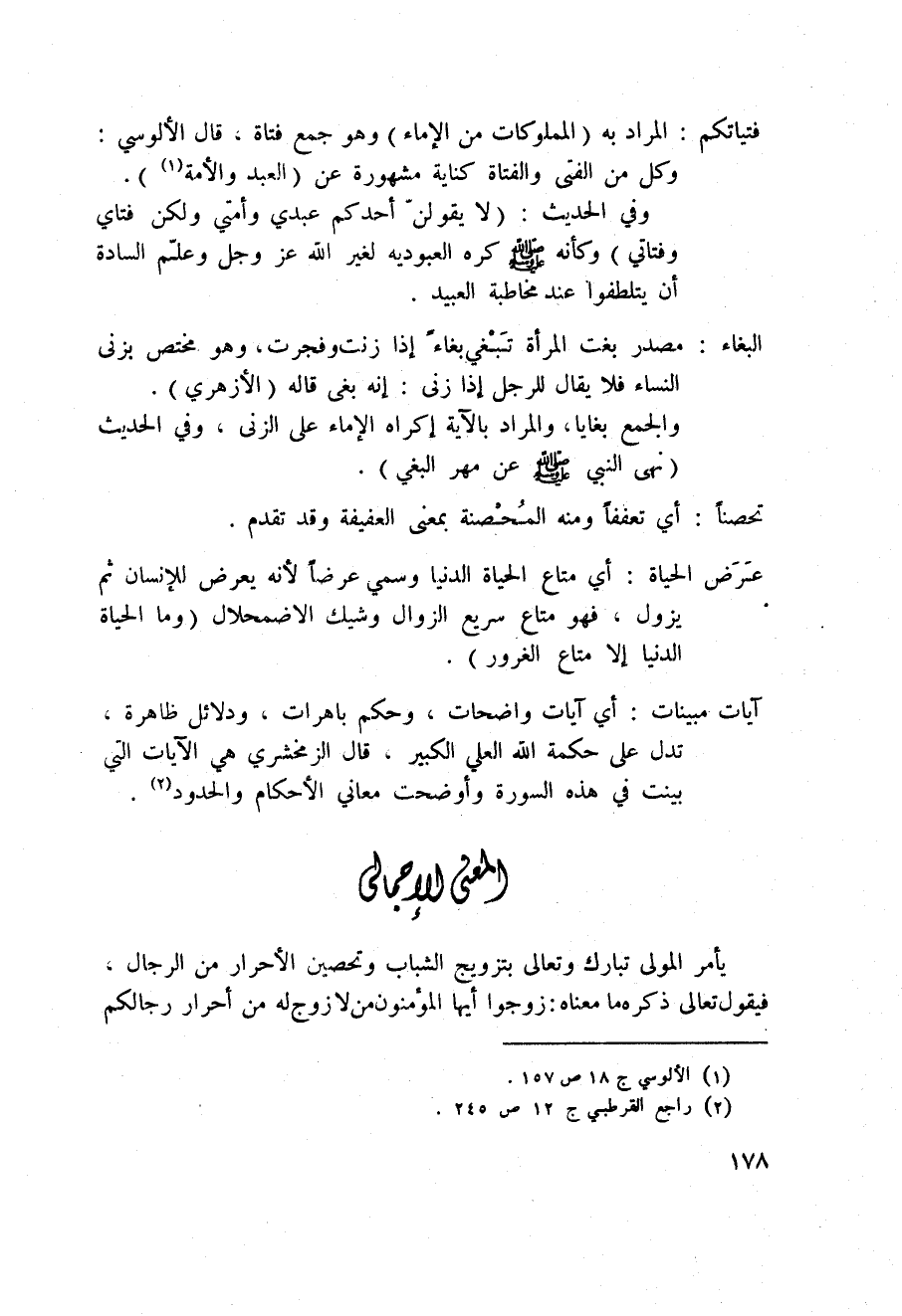 يأمر المولى تبارك وتعالى بتزويج الشباب وتحصين الأحرار من الرجال، فيقول تعالى ذكره ما معناه: زوجوا أيها المؤمنون من لا زوج له من أحرار رجالكم