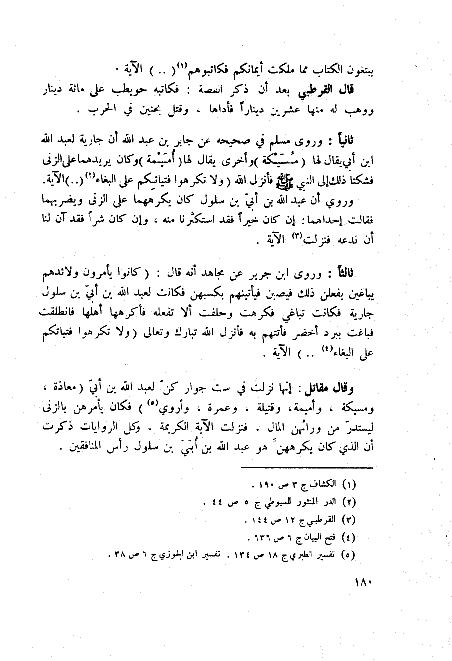ثالثاً: وروى ابن جرير عن مجاهد أنه قال: (كانوا يأمرون ولائدهم يباغين يفعلن ذلك فيصبن فيأتينهم بكسبهن فكانت لعبد الله بن أبيّ سلول جارية فكانت تباغي فكرهت وحلفت ألا تفعله فأكرهها أهلها فانطلقت فباغت ببرد أخضر فأتتهم به فأنزل الله تبارك وتعالى: {وَلاَ تُكْرِهُواْ فتياتكم عَلَى البغآء ... } الآية.