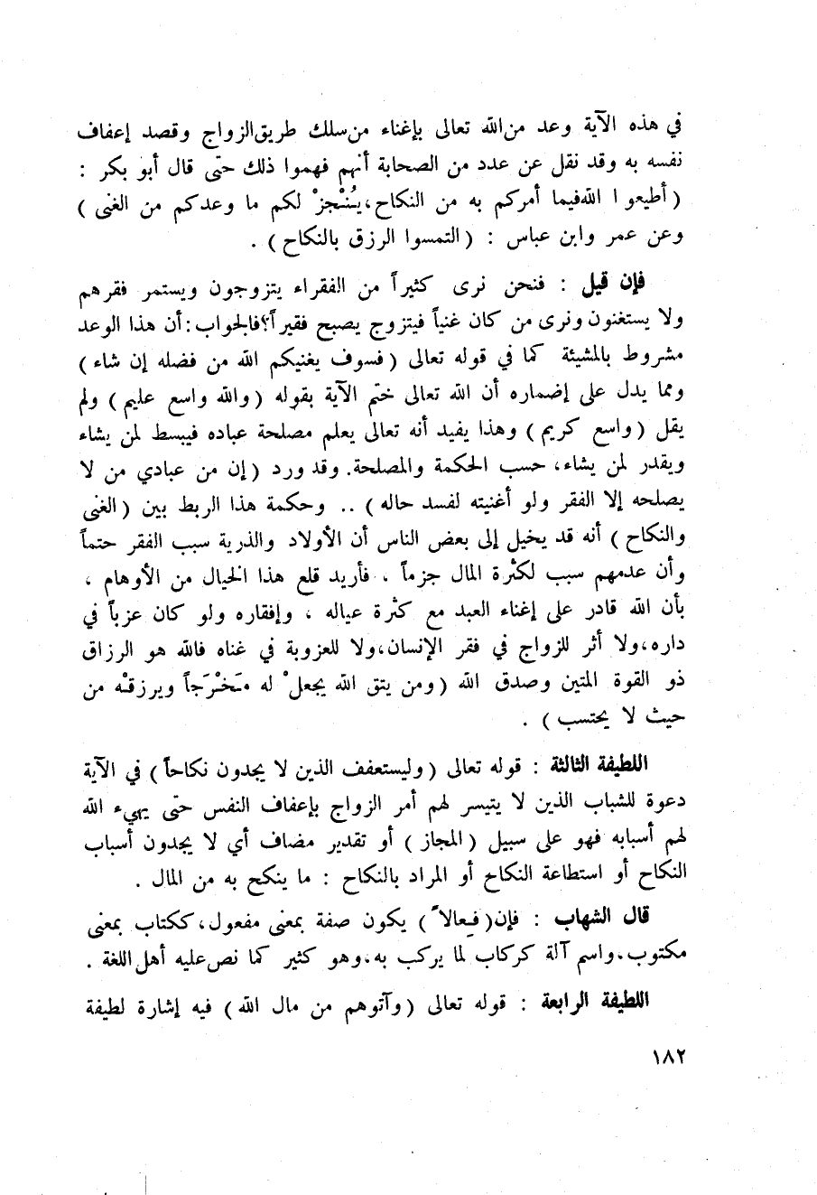 وحكمة هذا الربط بين (الغنى والنكاح) أنه قد يخيل إلى بعض الناس أن الأولاد والذرية سبب الفقر حتماً وأن عدمهم سبب لكثرة المال جزماً، فأريد قلع هذا الخيال من الأوهام، بأن الله قادر على إغناء العبد مع كثرة عياله، وإفقاره ولو كان عزباً في داره، ولا أثر للزواج في فقر الإنسان ولا للغزوبة في غناه فالله هو الرازق ذو القوة المتين وصدق الله {وَمَن يَتَّقِ الله يَجْعَل لَّهُ مَخْرَجاً وَيَرْزُقْهُ مِنْ حَيْثُ لاَ يَحْتَسِبُ} [الطلاق: 2 - 3] .